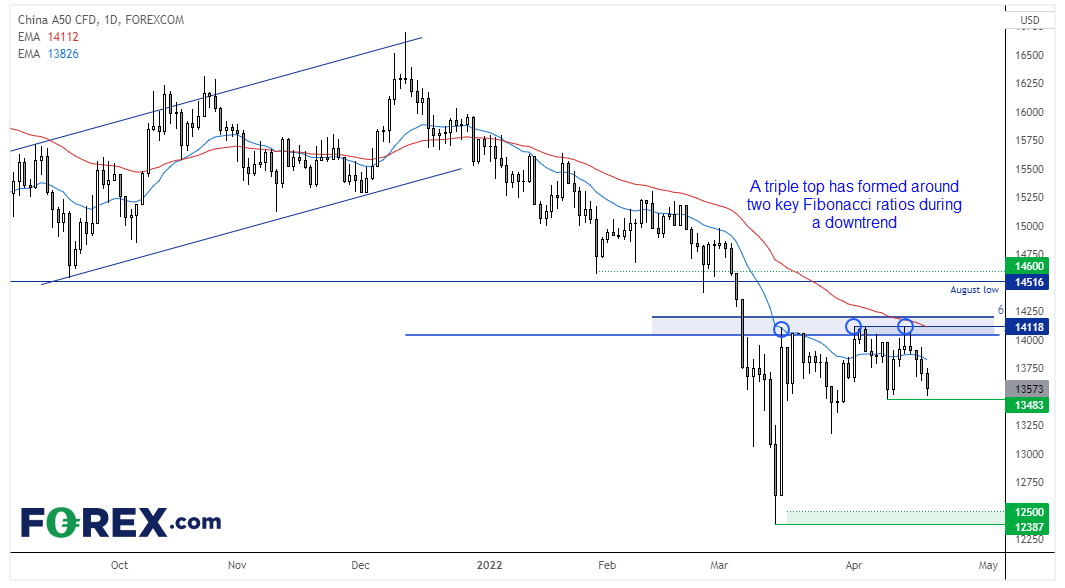 大型股表现不佳,我们保持对中国A50指数看跌。股指自2021年2月以来一直处在一条强势下行趋势当中,近期回撤已触及阻力,三顶也已于斐波拉契水平区域成形。动量近期转跌,因此修正高点或已在14118就位。我们需看到价格下穿13480(或日线图收于其下)才能假设股指已重拾跌势。