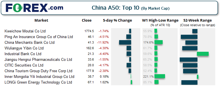 本周早些时候,中国人民银行(PBOC)公布了针对受疫情影响个人和企业的帮扶措施,不过初步反馈表明,相较问题的严重程度,这些措施可谓杯水车薪。尽管如此,据报道,今天中国人民银行与中国银监会开会讨论如何对实体经济金融纾困,但细节尚未公布。从上表中我们可以看到,富时中国A50指数排名前10股票中,有8只仍徘徊于1年低点附近。