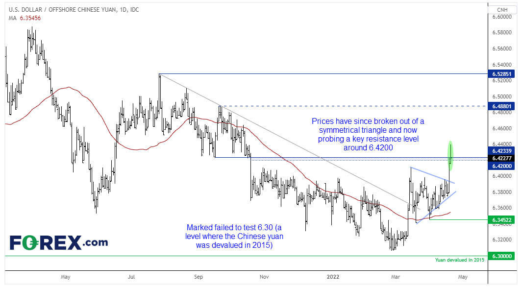 汇率角度来看,中国有更多削弱人民币的理由。我们曾预期过美元/离岸人民币的强劲反弹,今天价格升穿6.42阻力,因此,这可能成为我们曾于三月中讨论过的数月反弹早期阶段。