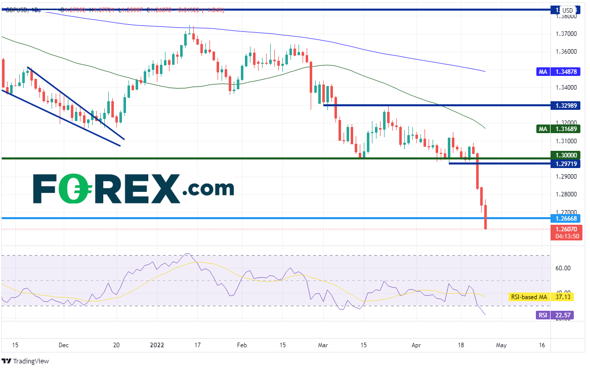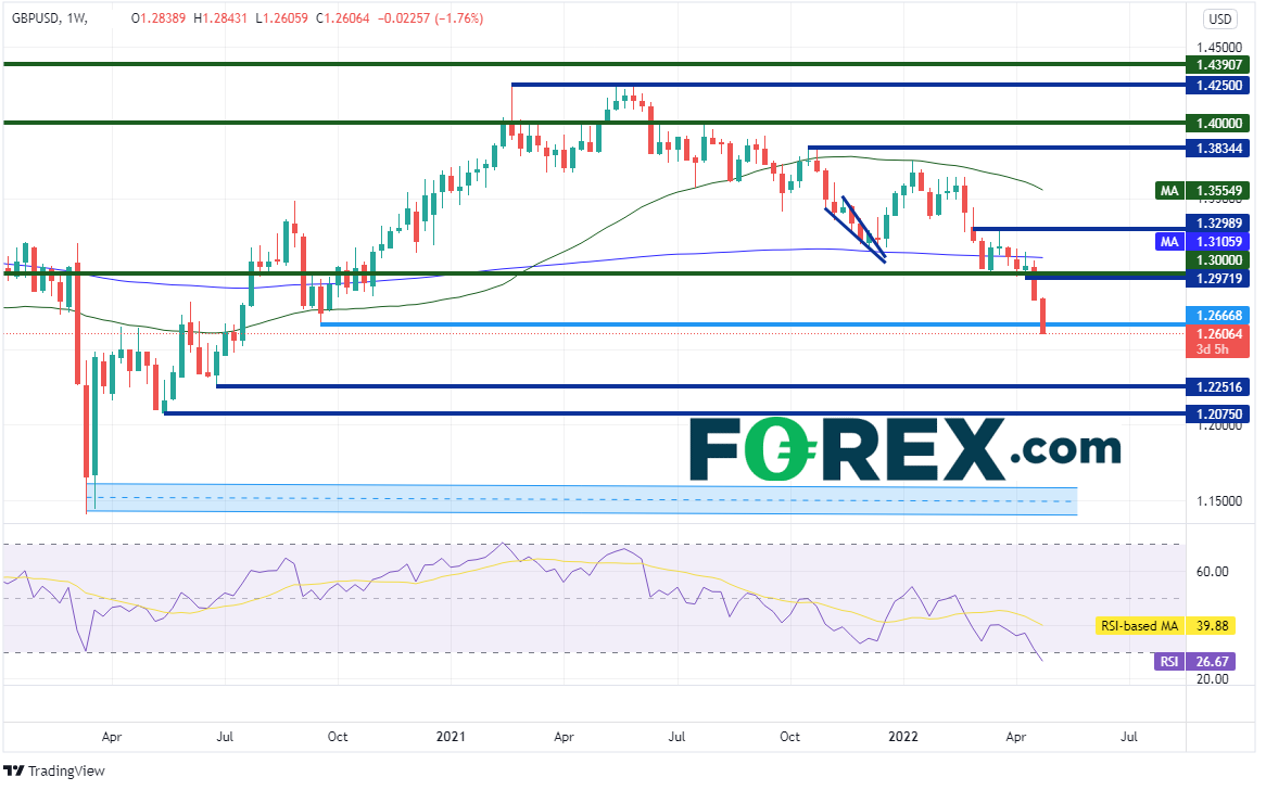 英镑/美元自2021年6月在1.4250创下高点以来就不断下跌,在英国央行上次会议之后延续跌势。当时英国央行就通胀,特别是俄乌战争引发的通胀可能挤压家庭收入提出警告。英国未来加息的节奏可能取决于通胀中线前景。英国3月通胀率自2月的6.2%上升至7%。但英镑/美元开始急剧下滑始于上周数据显示,消费者信心与零售销售双双远弱于预期。家庭收入减少、经济数据弱于预期和强势美元足以联袂推动英镑/美元下破1.3000的心理整数关口,且令其再无挣扎之力。英镑/美元目前交投于2020年7月以来最低点,但没有像美元指数和欧元/美元那样逼近2020年3月价位。英镑/美元在2020年3月疫情最严重时期触及1.1445低点。周图上水平支撑位在比较遥远的1.2252和1.2075,如果失守,价格可能跌至2020年3月低点。请注意,周图上RSI超卖,表明价格有回升的可能性。