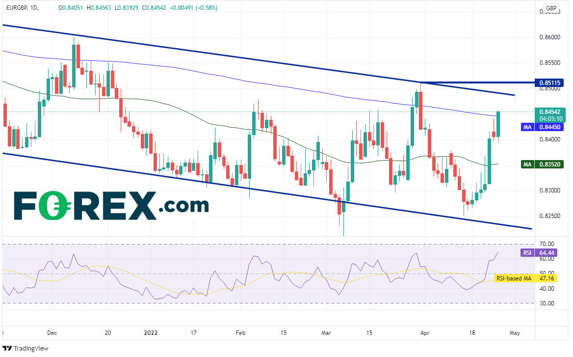 最近走出行情的英镑货币对不仅有英镑/美元,还有欧元/英镑。后者自2021年4月以来一直交投于下降通道内,但4月18日以来不断走高,今天还形成了看涨吞噬K线。欧元/英镑还站上200天均线0.8445,使其转化为第一支撑位。下个支撑在今天低点0.8393,然后下看50天均线0.8352。如果价格继续上涨,先后上看通道上轨下降趋势线0.8490附近、3月31日高点0.8512。