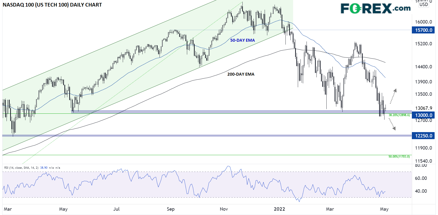 纳斯达克100指数4月跌逾13%,创下全球金融危机以来最大跌幅,接下来将要迎来备受瞩目的FOMC会议及至关重要的非农就业报告。该股指目前在考验13000附近的关键支撑位,其为3月以来和去年5月以来的前支撑位兼疫情后期反弹行情的38.2%回档位。所以,交易员在迎来本周重要事件之前目不转睛地盯着该技术区域: