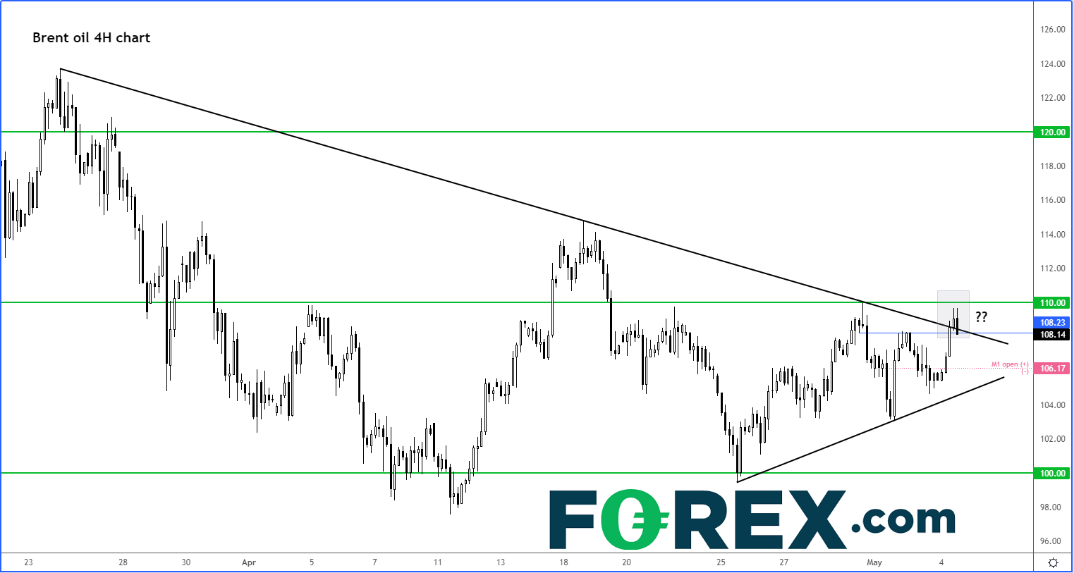 布伦特原油在100.00的心理大关上方盘整了数周,或已在该位附近筑底。如果守住4小时图趋势线上破位,价格或再上台阶,进入110-120区间。在俄罗斯原油禁运和OPEC当前政策姿态助力下,继续上涨的几率尤其高。