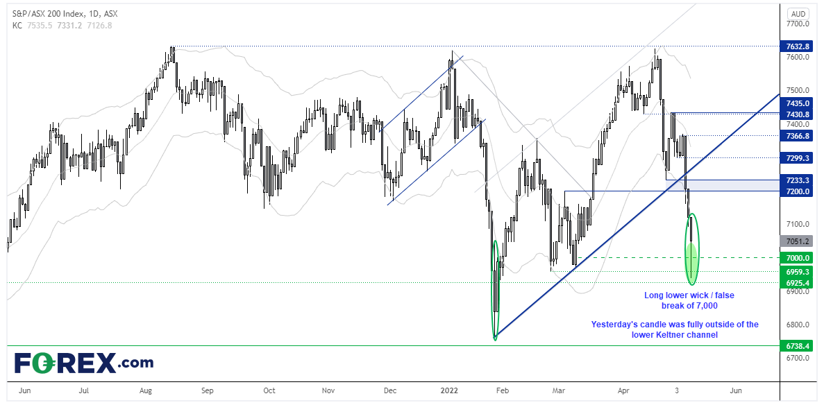 本例中我们看到指数未能下破7000且随后收于其上。事实上,当天波动区间的一半左右发生于站上7000点之后。美股下跌动能正在丧失,加上ASX200指数昨天完全超越其Keltner带下轨,我们怀疑现在有回归均值的机会。今天是低波动性、震荡区间交投还是急剧调头的一天尚不可知,但基于昨天价格走势的判断,提请读者小心在这些价位做空的风险。