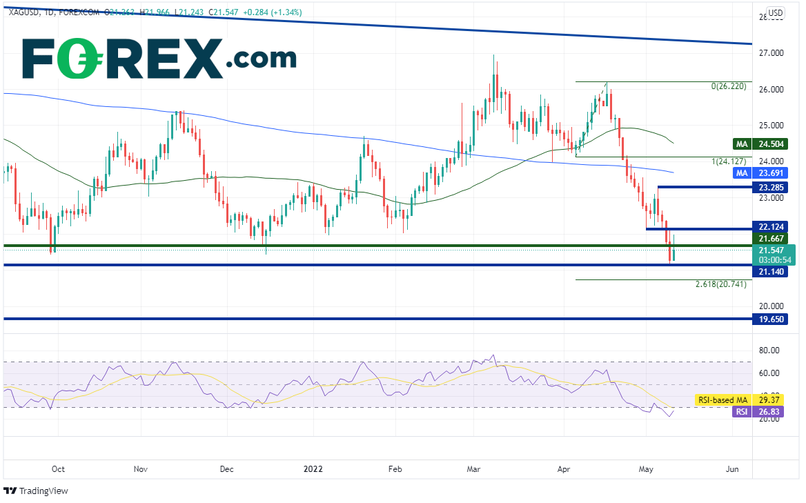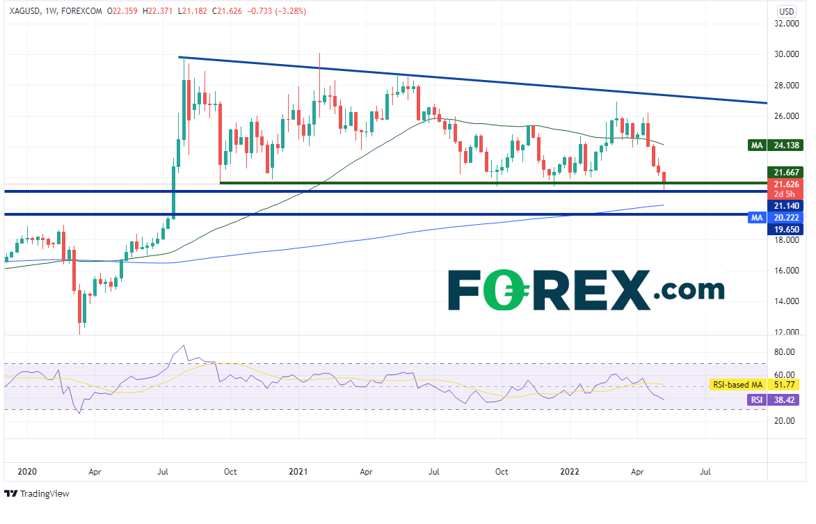 日图上白银价格4月18日到达26.22高点以来的跌势更加清晰。此贵金属自那以后跌逾19%,如果击穿水平支撑位21.14,可能跌至4月6日低点到4月18日高点行情的261.8%扩展位,即20.74附近。如果失守,后市可能跌至200周均线20.00(请看周图)。但请注意,RSI处于超卖区域,表明价格或准备回升。5月2日低点以来的水平阻力位落在略高的22.12,如果告破,可能先后上看水平阻力位23.28和200天均线23.69。