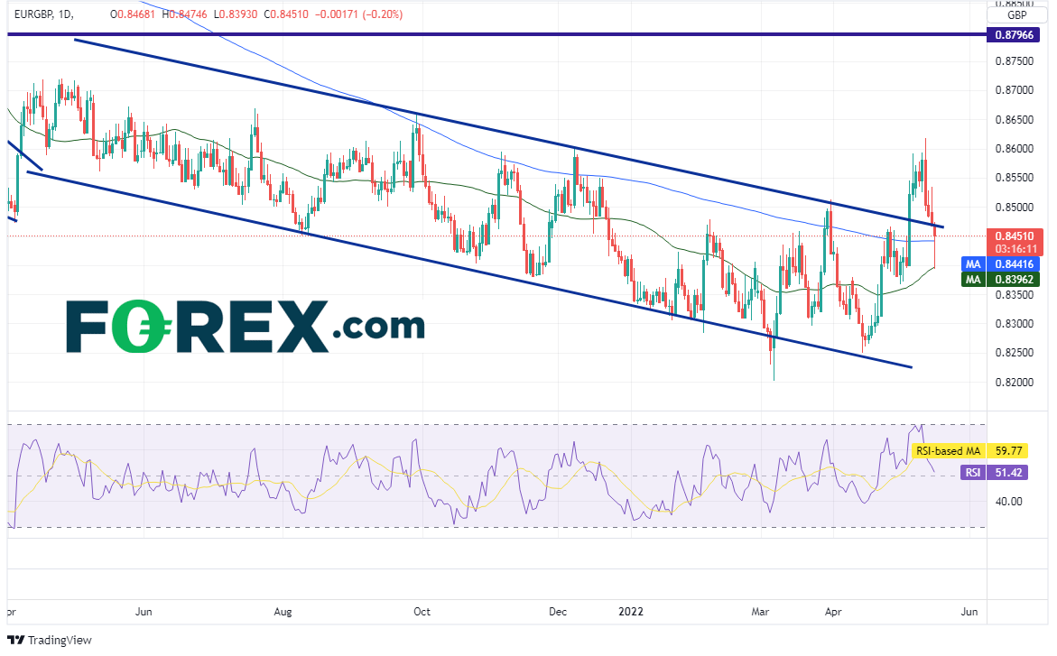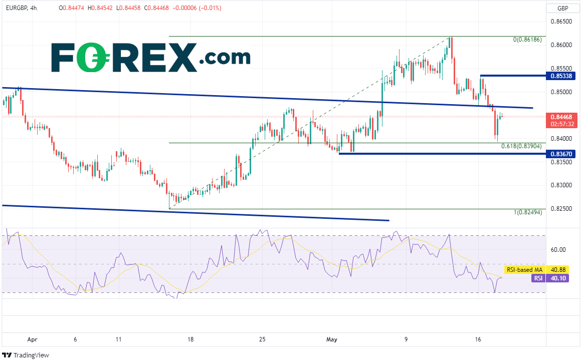 欧洲央行的立场正趋于强硬,而英国央行因为预期成长放慢而没那么乐观。这或促使交易者预期欧元/英镑上涨,但该货币对过去4天反而下跌。交易者将观察,今天日图上的锤子形态是否足以构成短线底部,继而推动货币对上涨。