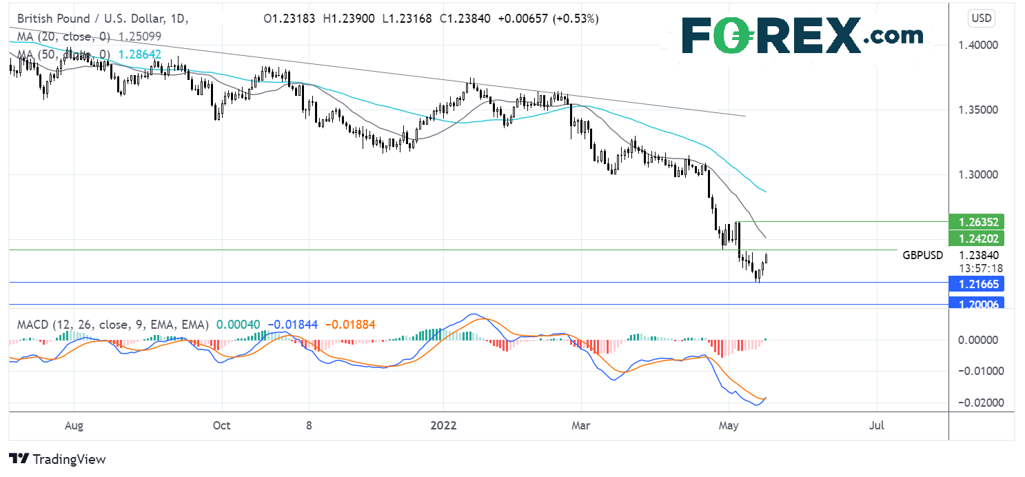 多头目标可能是重拾4月28日低点1.2410,再收复20期均线1.25,然后剑指5月高点1.2635。