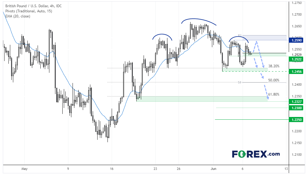 昨天报告中提到的潜在头肩顶部已通过下破1.2456获证,但过去12小时的政治情势引发汇价区间震荡。汇价现交投于1.2500-1.2600区间中点附近。如果守住1.2530区域支撑,多头可能会低吸并将目标锁定1.2590高点。但由于对英国首相信任匮乏,我们更倾向于在1.2590阻力位附近或下方寻求入场做空,或者在该区间下部做空。若美元在本周通胀报告出炉前继续走强,将确认头肩顶部。