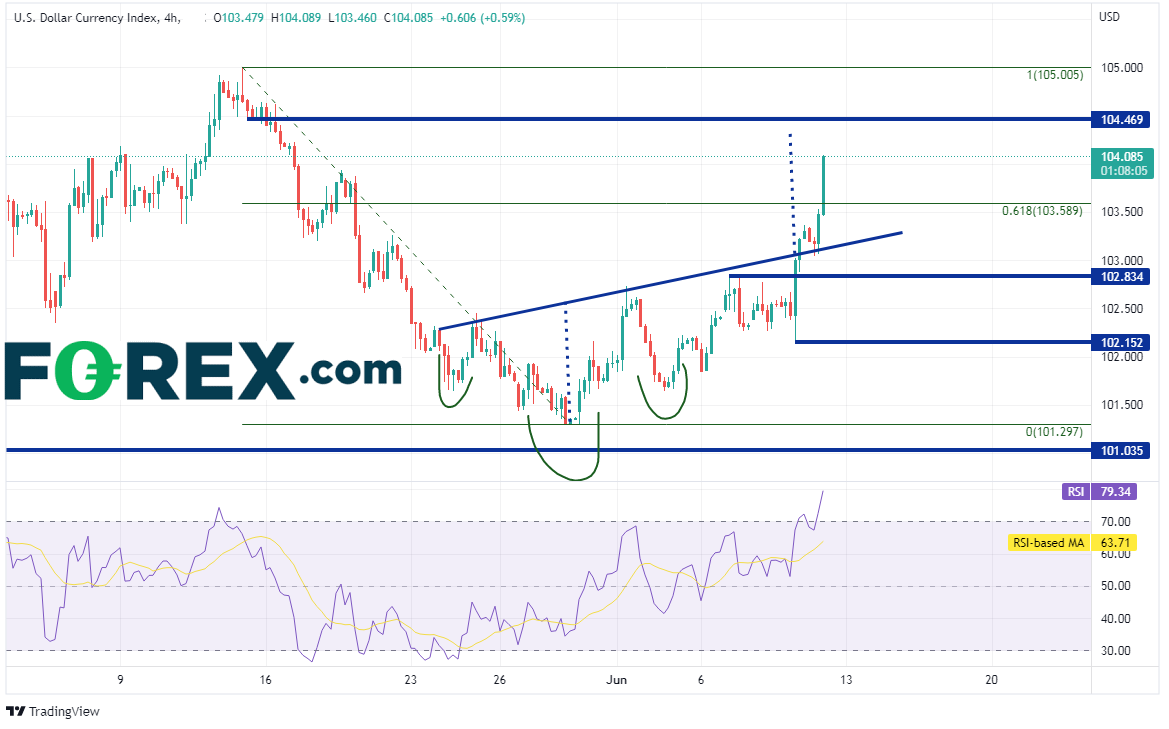 CPI年率上升,暗示美联储继续积极紧缩银根的可能性,美元因此得到买盘青睐。美元指数在5月13日于105.00一线创下2002年12月以来最高点,随后回撤至50天均线和3月31日低点到5月13日高点行情的50%回档位,即101.30附近,之后再度走高,终在今天站上5月13日高点到5月30日低点行情的61.8%回档位103.59附近。
