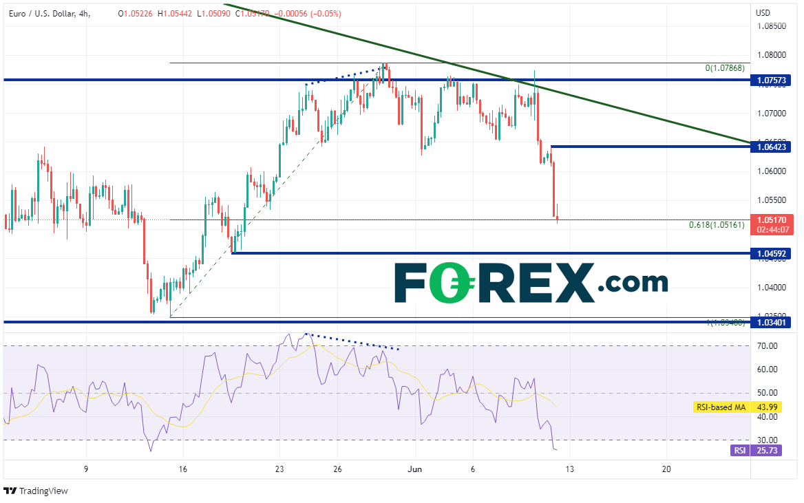 构成美元指数57%权重的欧元/美元与美元指数反向波动。该货币对4小时图正在考验5月13日低点到5月30日高点行情的61.8%回档位1.0516附近,下方有5月18日低点以来水平支撑位1.0459、5月13日低点1.0349(距2017年1月低点只有区区9点子)。请注意4小时图RSI超卖,表明价格或准备回升。上方阻力有今天高点1.0642和长期下降趋势线(请看图示绿色线)所在的1.0735附近。