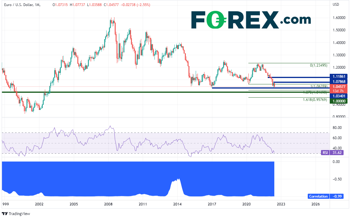 构成美元指数57%权重的欧元与美元指数反向波动,下图底部显示两者目前在月图上的相关系数,报在-0.99,非常接近于显示两者完全负相关的-1.00,即两种交易产品的走势在100%的时间里背道而驰。如果欧元/美元继续下跌,后市支撑位先后有2020年3月以来低点1.0340、2020年3月低点到2021年1月高点行情的127.2%扩展位1.0170、心理整数位1.0000。如果守住支撑位,可能上看2020年3月以来低点1.0636、水平阻力位1.0787和1.1186。