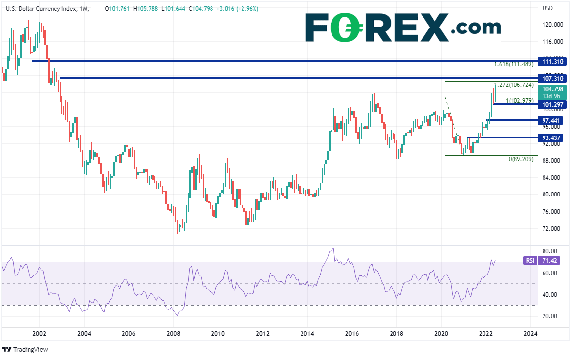 美元指数的较长期图表显示,受益于加息前景,价格摸至2002年11月以来最高点。月图第一阻力在2020年3月高点到2021年1月低点行情的127.2%扩展位,即106.72附近,然后可能上看2002年12月以来水平阻力位107.31,接着或上攻由2001年9月以来水平阻力位和前述行情的161.8%扩展位组成的阻力带,即111.31/111.49一线。但请注意,月图RIS正处于超买区域,小心价格回撤的可能性。第一支撑位在5月低点101.30,然后是水平支撑位97.44和93.43,以及2020年3月低点89.21。