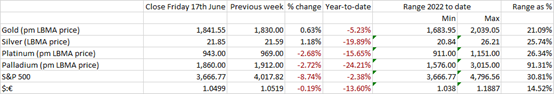 与此同时,COMEX 6月14日当周(当时金价自1850跌至1818)主动型基金持有的黄金头寸锐减。多头裸持仓在4月中旬高达514吨,当周骤降,上周二为339吨,降幅达到34%;空头裸持仓同期增加75吨,增幅50%,达到225吨。以上,现在净头寸为115吨,是2021年10月以来最低点,是前12个月均值的56%。当期白银多头裸持仓小幅增加,但空头裸持仓跃升850吨(16%),净多头因此为1609吨。银价跌幅因此和平常一样远大于黄金跌幅,从22.28美元跌至21.05美元,跌幅6%。相比之下,黄金跌幅为2%。自那以后,白银同样获得部分逢低买盘,无疑也有更多的空头回补。白银在22遇阻,黄金回到1840。二者5月中旬以来实际上一直横向窄幅波动,上档压力沉重。金价上档都面临短期均线的阻力,而且基本面一定程度支持上涨,但或许需要奋力挣扎才能实现。好的一面是,黄金一直在其10天均线上方窄幅交投,只是1873下方压力重重。