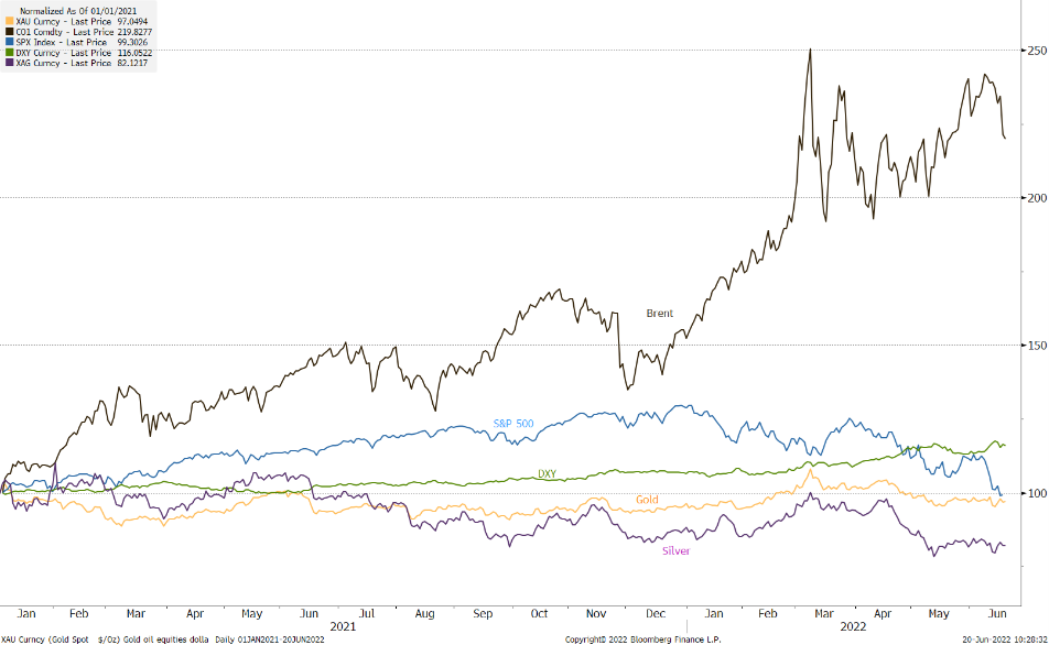 上周股市暴跌。当时美国联邦公开市场委员会提前加息,而欧洲央行在6月常规会议刚过去一周就召开了一次紧急会议。标普500指数暴跌近9%,欧洲市场同样下跌但表现好一些。除了瑞士股市跌幅高达4%之外,欧洲股市的普遍跌幅在2.0%-2.5%之间。事实上,股市的跌势始于前一周,原因是美联储加息75个基点的可能性越来越大,市场越来越焦虑。
