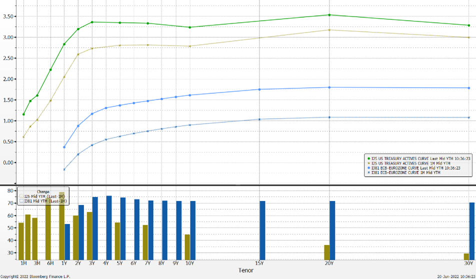 6月20日及前四周的美国与欧盟债券收益率曲线