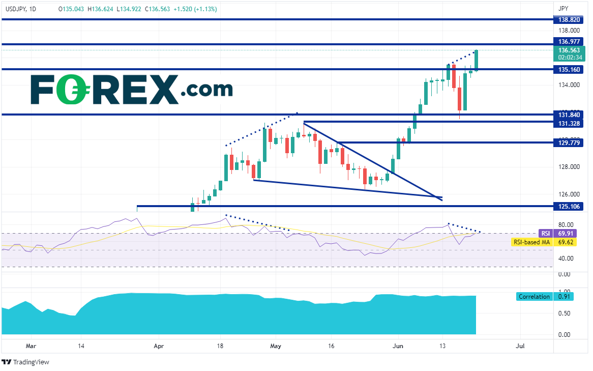 但请注意,日图RSI目前与价格背离。4月底/5月初出现同样情况时,价格回落至下降楔形内。这次历史会重演吗?如果重演,价格可能先后下看6月14日以来高点135.47、6月16日低点兼5月9日以来前高点131.33和水平支撑位128.78。