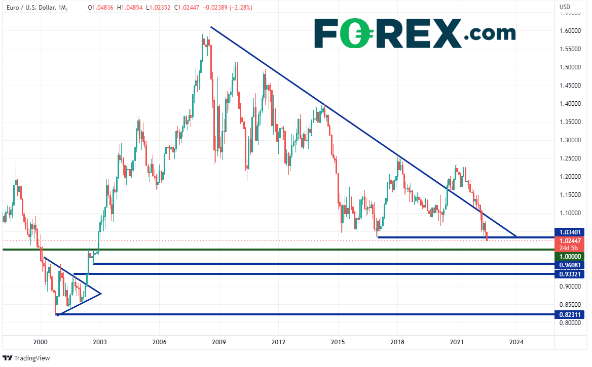 但1.0000只是个心理价位,不具有任何意义,欧元/美元能够低于平价。货币对上次下破1.0000是在2002年12月,在20000年1月和2002年7月之间,也曾低于平价。月图水平支撑位在0.9608 和 0.9332。欧元/美元甚至曾于2000年10月,触及0.8231低点。