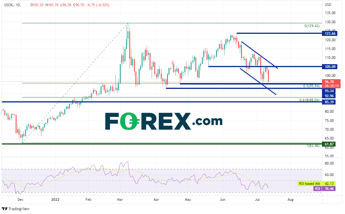 西得州原油一度尝试测试3月8日高点,后调头向下。6月14日最高仅到达123.66,然后开始下跌,上周最低触及95.13,略低于2021年12月2日低点到3月8日高点行情的50%回档位和水平支撑位。油价之后回升至105.09附近的水平阻力位,但再度开始走弱。油价今天考验上周以来的近期低点,此文发稿时下跌7美元,失守96.50。