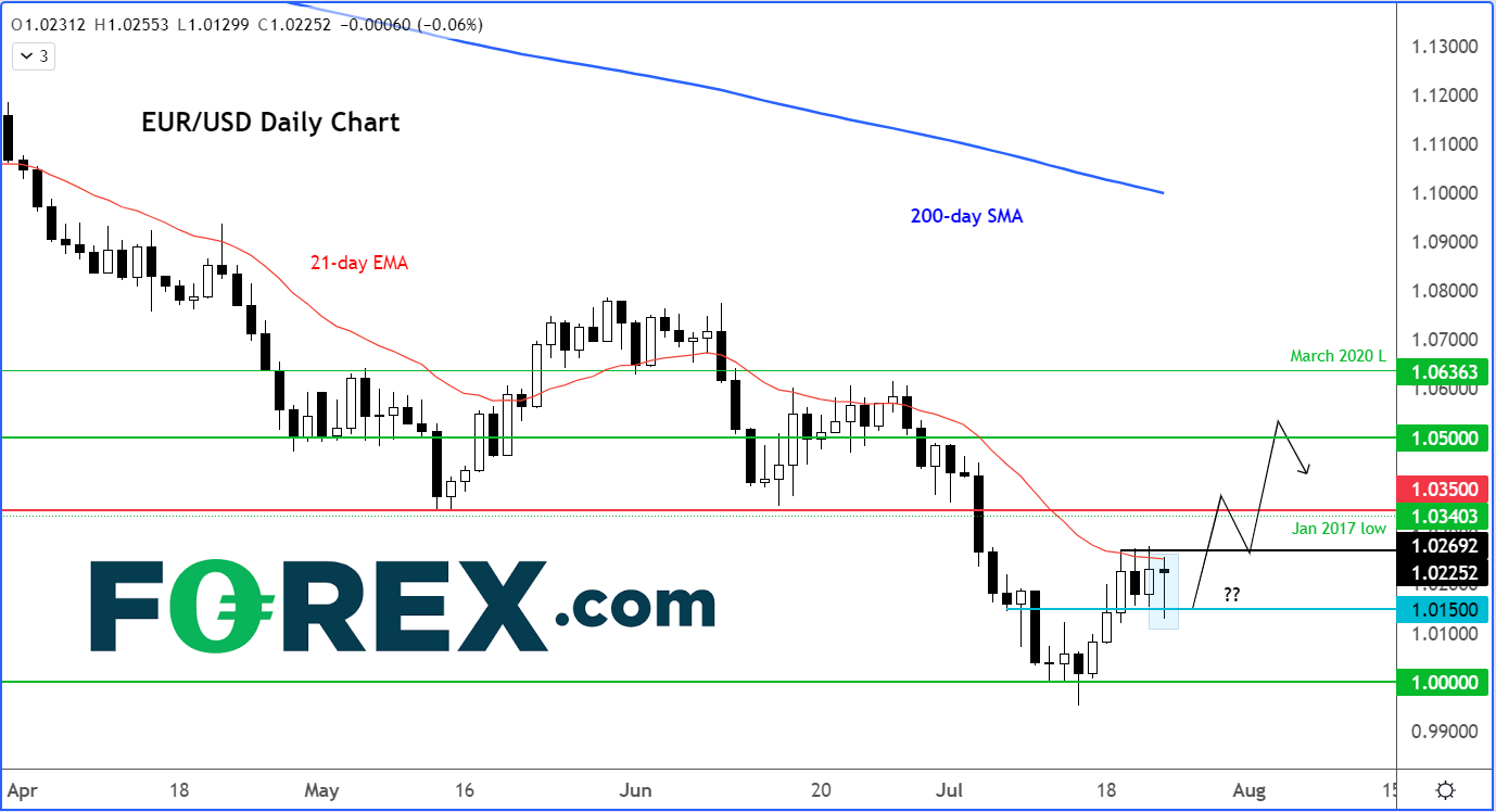 - 欧元区 CPI 和 GDP(周五) – 欧洲央行终于动手抗击通胀,加息50个基点,且央行行长拉加德警告,通胀可能继续上涨,未来将视数据表现决定利率政策。CPI和GDP显然是这方面的重点,令欧元备受瞩目。