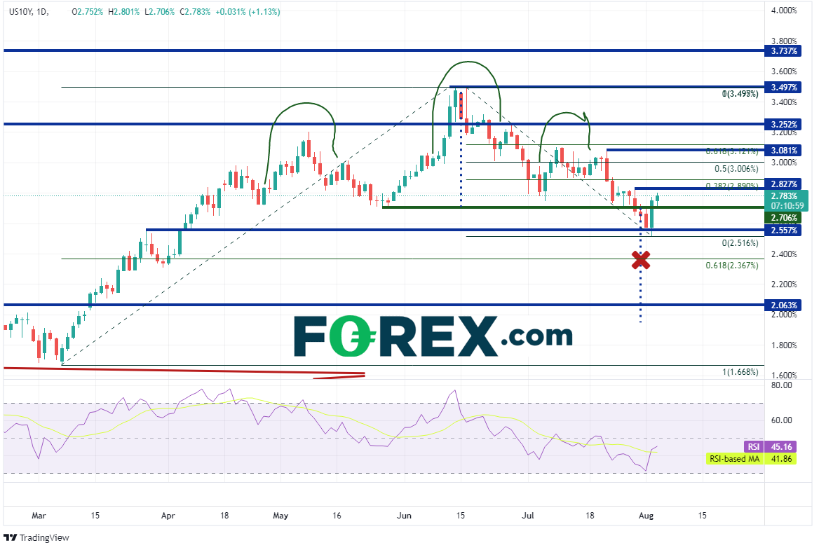 强硬评论推高美债收益率,10年期昨天斩获6.8%的涨幅,为2020年3月以来最大涨幅。自从6月14日创下3.497%高点,收益率不断下滑,于7月28日击穿头肩顶形态的颈线,即2.706%附近,做出下跌的准备姿态。但昨天的美联储官员讲话,促使收益率形成看涨吞噬K线,价格回到颈线上方,令头肩顶形态失效。收益率今天延续涨势,盘中最高到达2.801%。上方第一阻力在7月29日以来高点2.827%附近,然后可能摸至6月14日高点到昨天低点行情的38.2%回档位,即2.89%附近,接着是前述行情的50%回档位3.006%附近。第一支撑位在昨天低点2.516%,然后是3月7日低点到6月14日高点行情的61.8%回档位2.367%附近,接着可能跌至水平支撑位2.063%。
