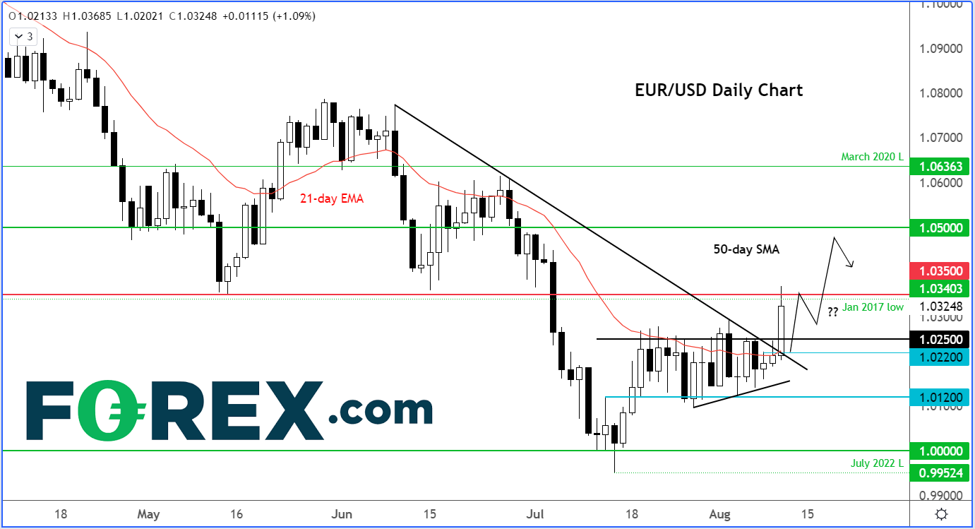 如果有一直追踪我的分析文章,读者应该知道最近几周我看好欧元/美元,认为其至少可以反弹至1.0350,而且整体上看跌美元。欧元/美元周三到达1.0350,而且之后还上涨了15点子左右,最终略有回落。1.0350是前关键支撑区域,现在一定程度构成阻力。但是,鉴于欧元/美元在今天反弹之前长时间窄幅盘整,后市继续冲高的几率很大。我认为,上看1.0500也并非不现实。不过,考虑到诸多障碍可能令欧洲能源需求无法得到满足,我对该货币对能否实现重大反弹也并不是很有信心。