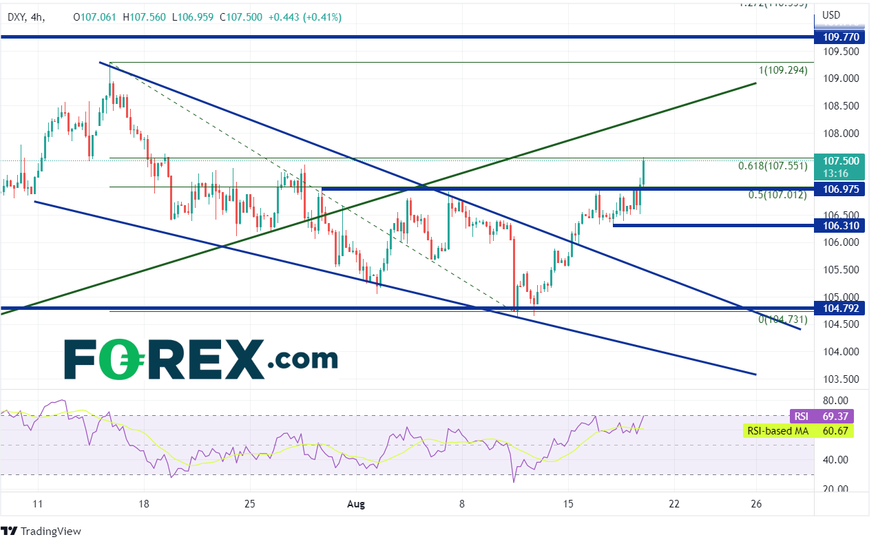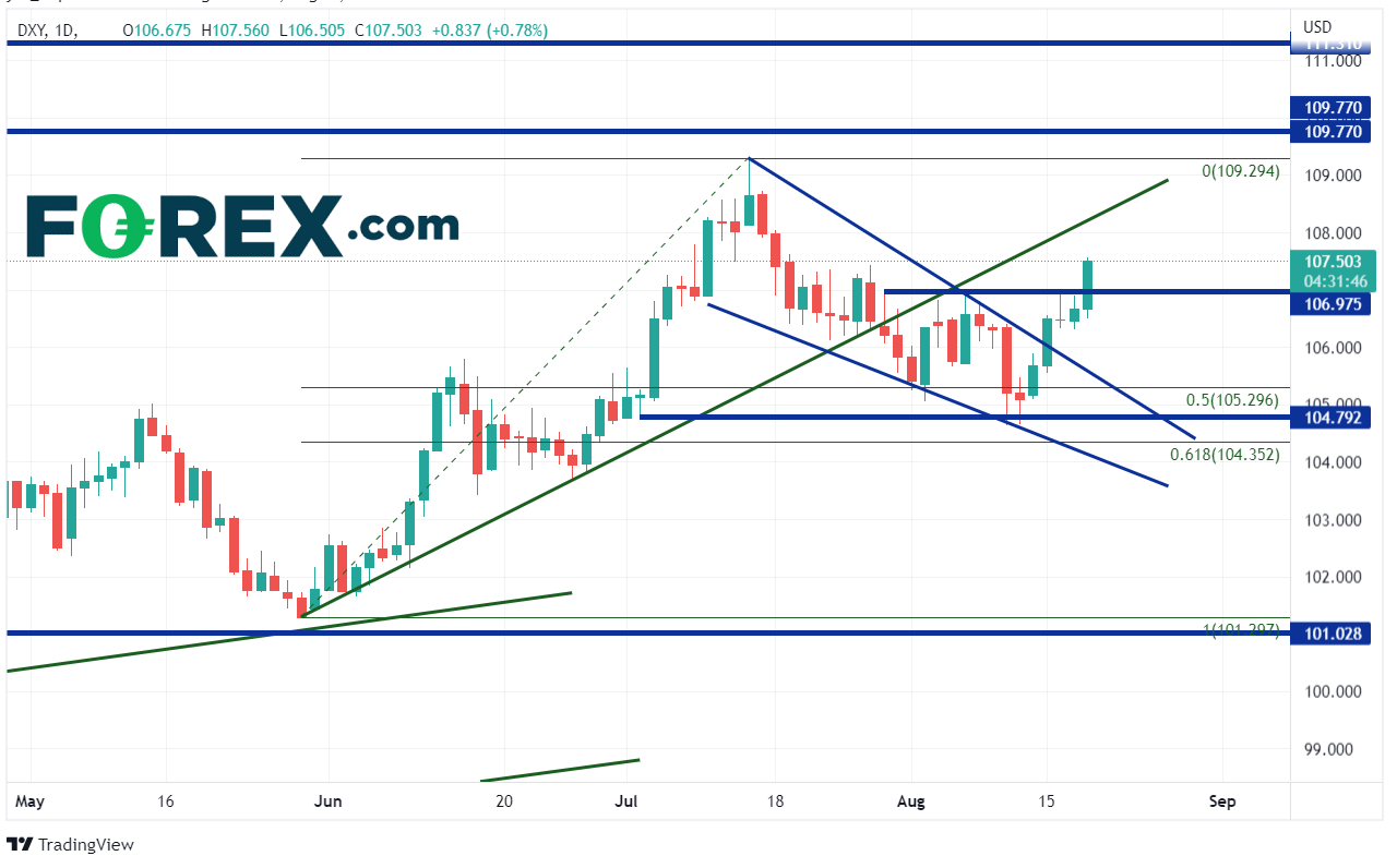 受强硬美联储官员评论的影响,美元指数当天上涨近1%。5月31日触及101.30以来,美元指数一直大举冲高,在7月14日之前创下20年高点109.24。此后,美元指数回撤并打破了5月31日以来的上升趋势线,回调行情形成下降楔形,于8月11日最低触及5月31日低点到7月14日高点行情的61.8%回档位上方不远处的104.65。两天后,美元指数站上下降楔形的上轨下降趋势线,于前高点106.98处遇阻。美元指数今天站上此阻力并强力走高。