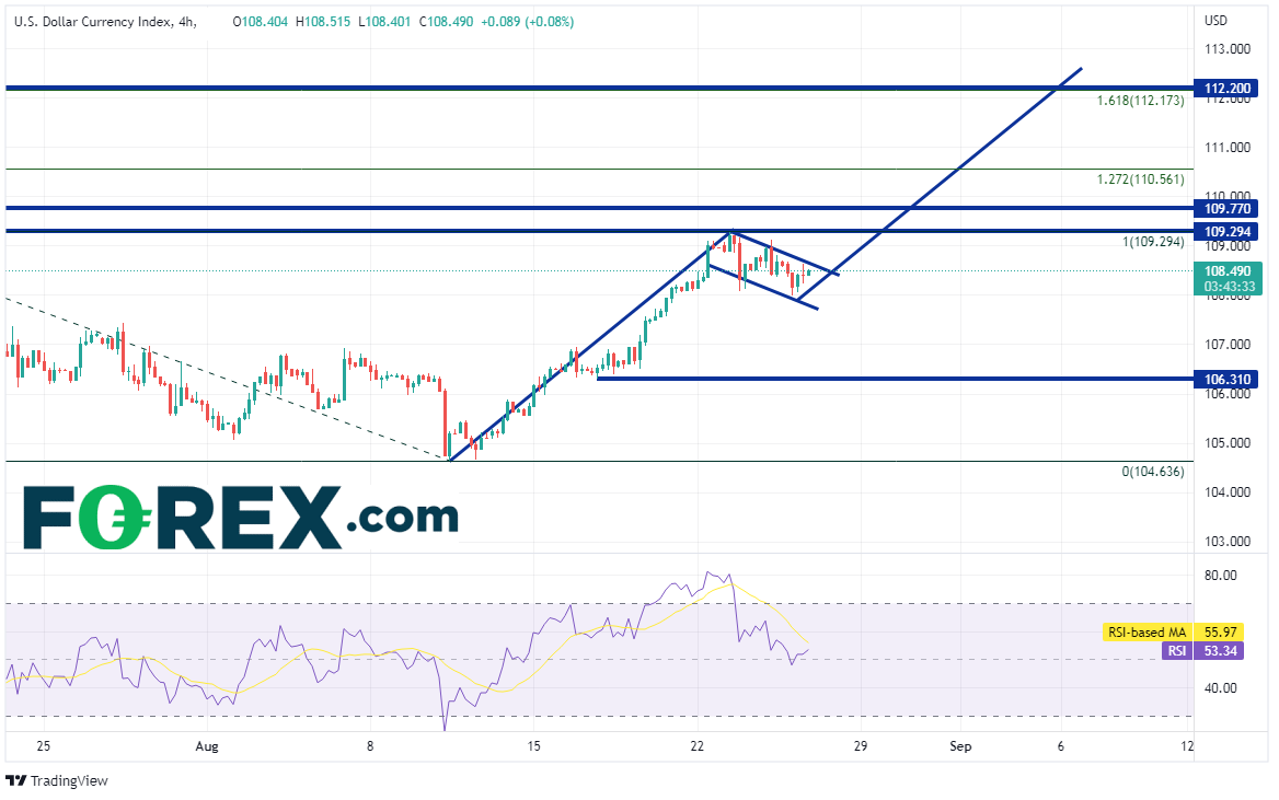 美元指数4小时图上近期上涨后于前高点下方进入盘整,可能形成旗形形态。如果价格确实打破前述形态,目标指向突破位加上旗杆长度,本例中在112.60附近。但在那之前还有前高点109.29、2002年9月以来高点形成的水平阻力位109.77以及7月14日高点到8月10日低点行情的127.2%扩展位110.56这些阻力。如果受制于阻力,下档支撑位先后有旗形下轨趋势线107.99附近、8月16日低点106.31和8月10日低点104.64。