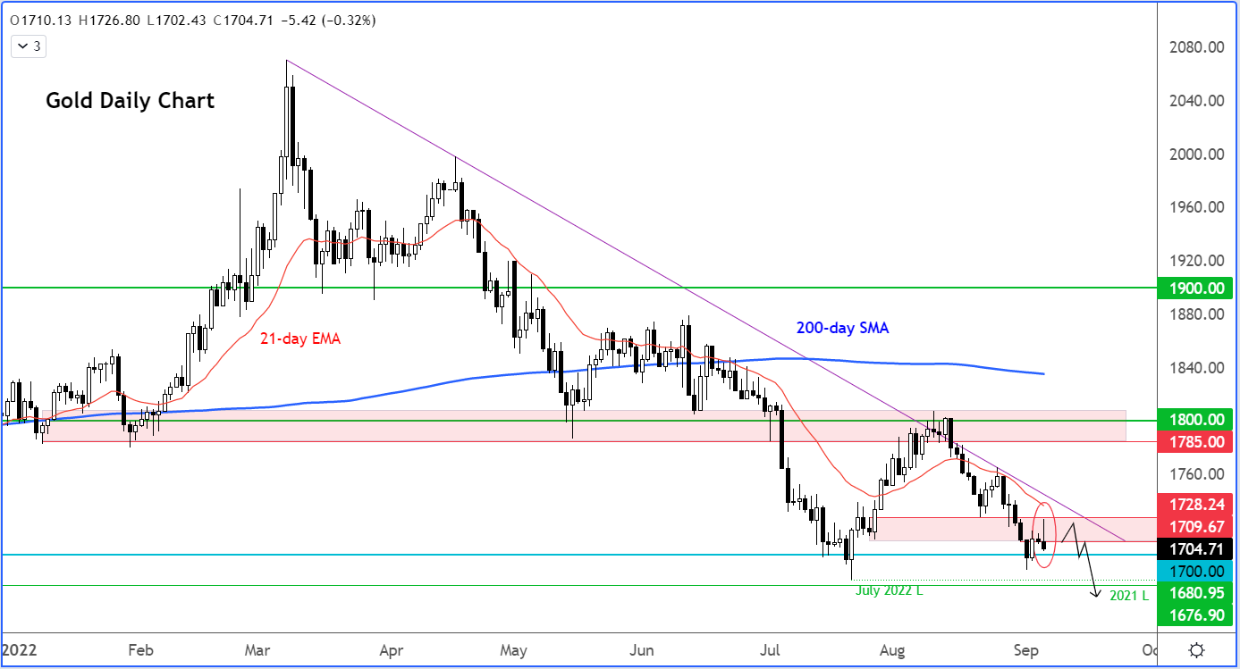 黄金未能守住早前涨幅,现在几乎可以确定会大举向下突破。对全球经济衰退的担忧继续提振美元买需,即使美元处于如此高位都没有改变需求。投资者越来越相信,美联储本月将再加息75个基点并且今后进一步积极加息,直到完成控通胀任务。