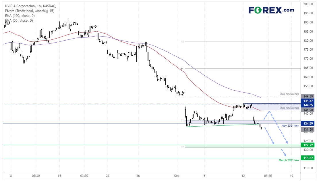 在纳斯达克大型科技股看跌候选者中,如果看技术面,英伟达可能最具吸引力。英伟达股价下破了50周指数移动均线,跌至疫情后期低点,按目前价格判断,周图可能形成看跌吞噬K线。价格从不到10个月前创下的记录高点下跌60%以上,这可能是个隐忧,但我们关注的是,价格创下周期新低伴随着成交量的放大。当然,我们观察的时间周期非常重要。但即使切换到日图,价格跌至疫情期间低点115附近的前景似乎也并没有不合理。