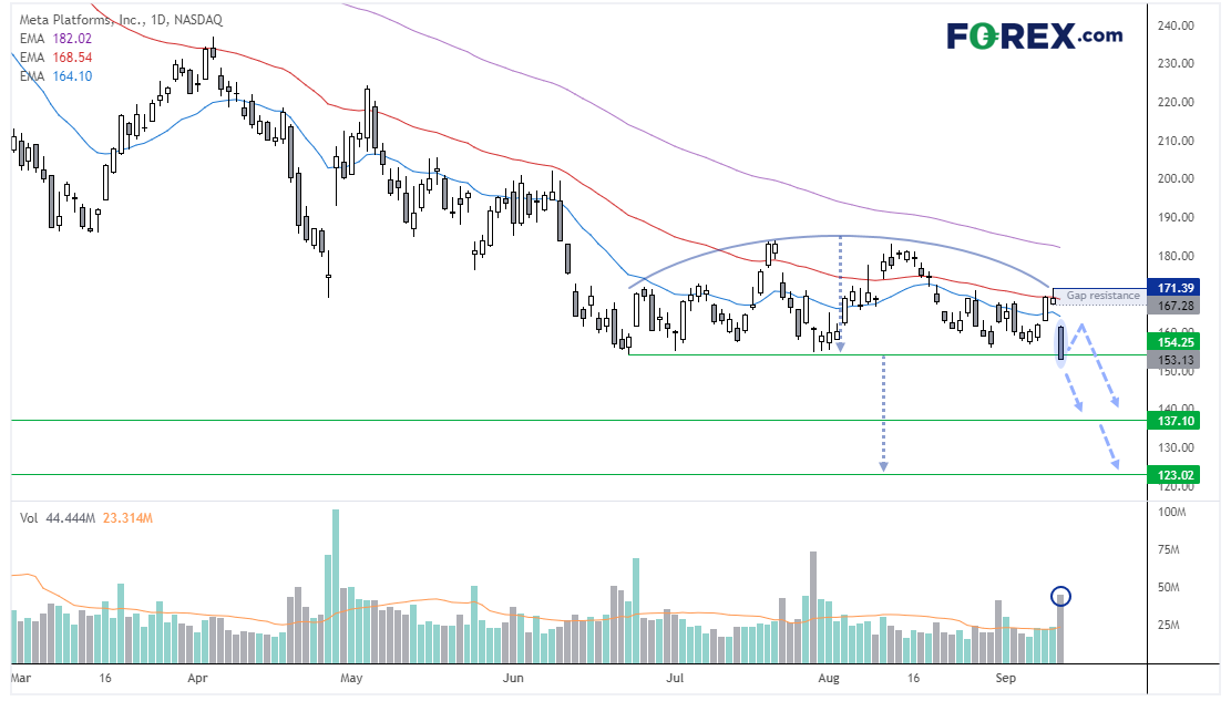 今天带着高成交量反弹的话,Meta股票的看跌吸引力就较为逊色,但我们会在跳空缺口阻力下方寻找波段高点就位的证据。然而,如果直接下破昨天低点(理想情况伴随着高成交量),则可以假设价格延续下跌,期间目标可能在137 – 140支撑区域,最终下看123。