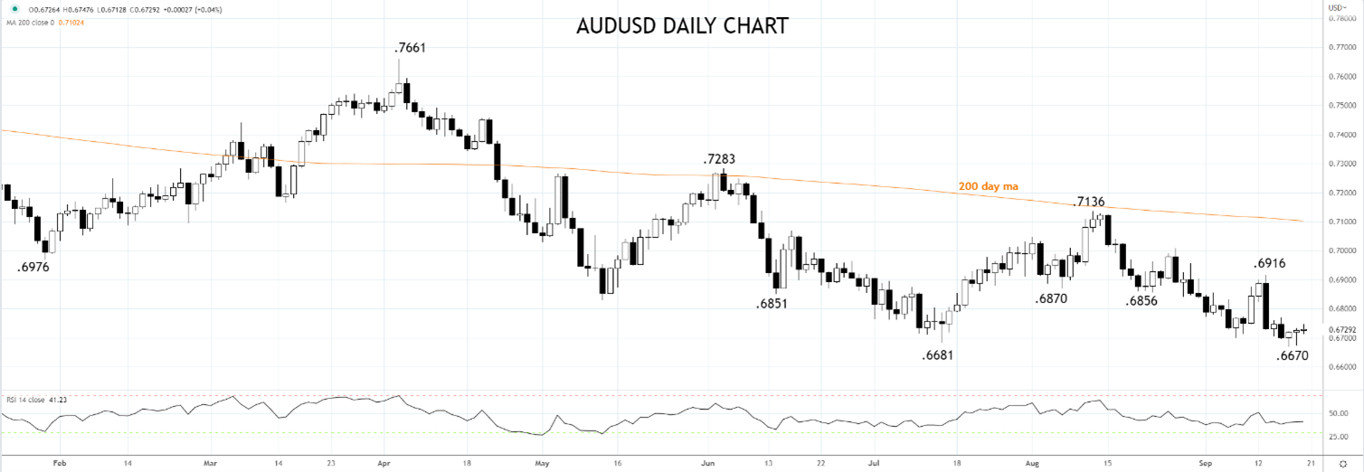 澳元/美元上周在0.6670创下2年新低,动力来自避险情绪和美联储年内继续大举加息以平抑顽固通胀的预期。