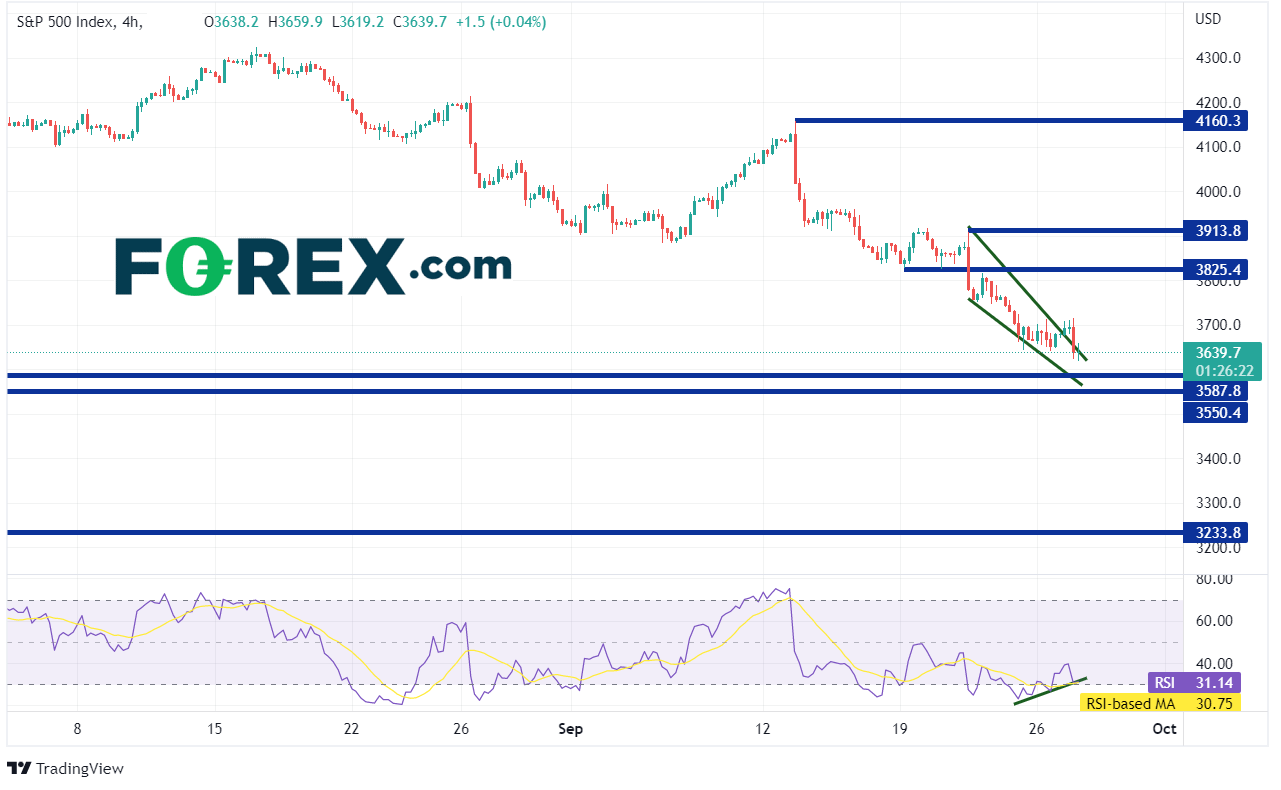 标普500指数在6月16日创下3638.8低点,之后回升并形成上升楔形形态,8月16日摸至水平阻力位兼200天均线4308.6附近。自那以后,这个大盘股指不断下跌,形成AB=CD形态,到达前行情的100%回档位。价格在周一继续下跌,并在周二于3620.2创下年内新低。