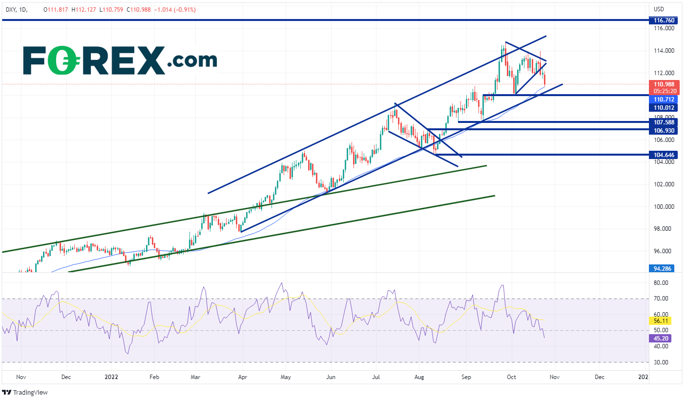 美元指数在四月初时仍不足100,之后进入急速上升通道。9月26日,指数假突破冲出通道,上探高点114.78,随后回撤落回通道内。自此,指数价格在通道中的对称三角形形态内盘整。然而在10月21日,日本央行疑干预外汇市场,抛售美元并买入日圆,而美元指数再度假突破冲出三角形态,随后遭抛压,最终收盘价位于三角形顶点下方。本周周一和周二,美元指数继续走低,目前在200天移动平均线110.71附近试探。
