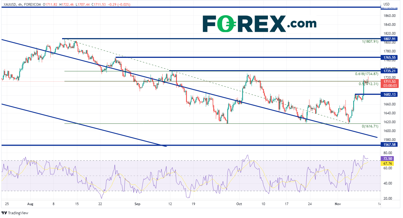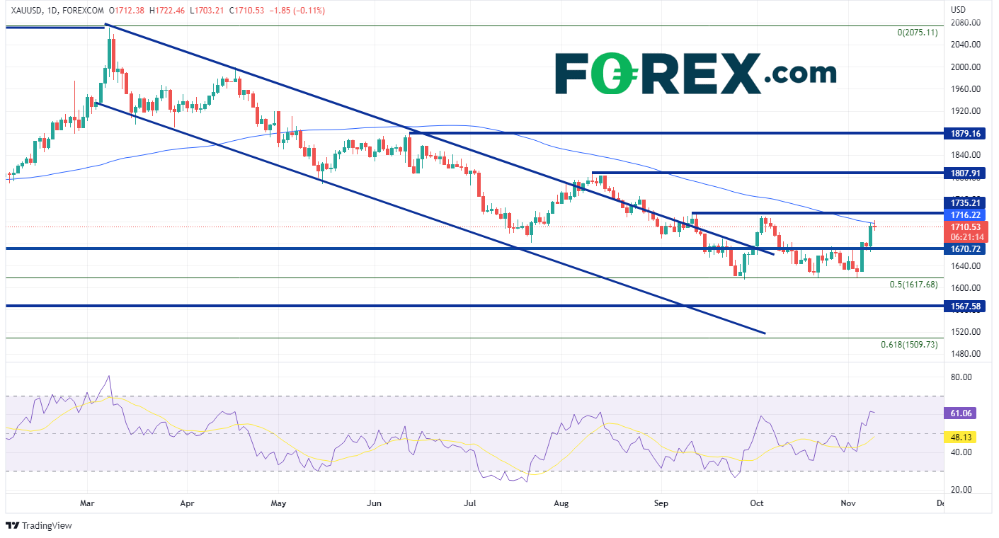 自2020年8月考验历史高点2075.11后,黄金自今年3月以来一直在通道中稳步走低,跌至2018年8月低点到2020年8月高点区间的50%回撤位1617.68附近。自9月28日以来,黄金曾三次尝试突破该支撑位,但均以失败告终。最近一次对该支撑位的考验发生在11月3日星期四,即美元发生暴跌的前一天。自那以后,黄金上涨了近100美元,现在正考验100日均线1716.21点位。