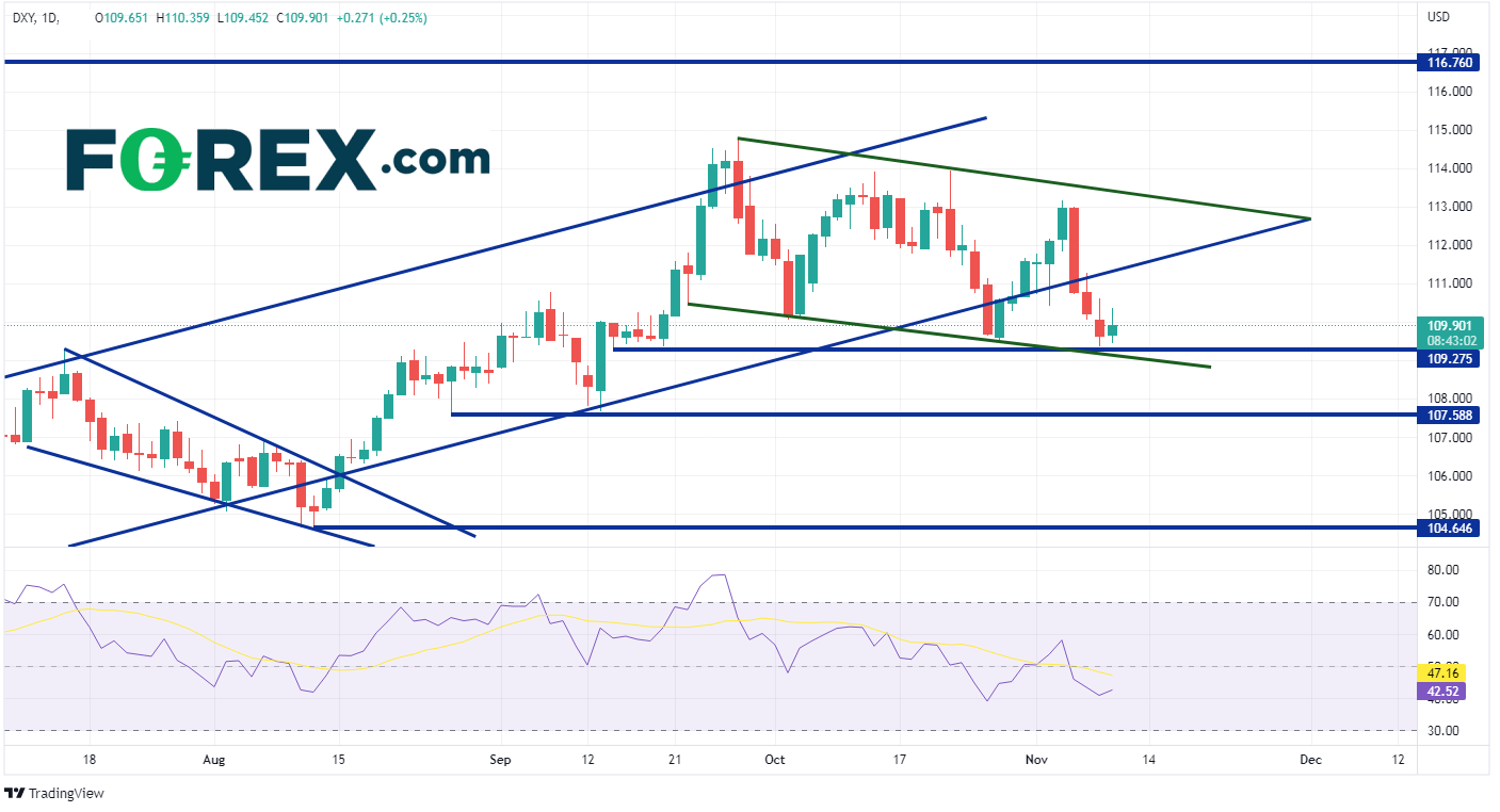 美元自9月28日创下114.78的高点以来持续走低。周五,DXY创下日内新高112.99。但到周二收盘时,美元指数跌至109.37,考验9月20日的低点。