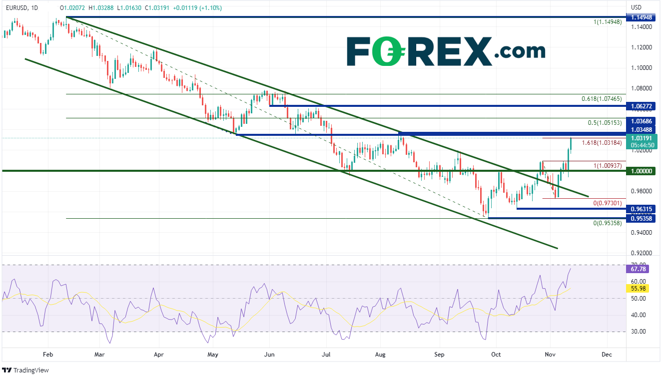 随着美国债券市场于周五收盘,同时密歇根消费者信心指数不包括新的通胀数据,因此美元在该指数发布后几乎没有变化。但美元的确在美国市场开盘后延续跌势,美元空头继续顺水推舟。从2月中旬到9月28日,欧元/美元在通道中稳步走低,该货币对一度跌至0.9536的低点。从那之后,该货币对持续走高,突破通道的上沿并继续攀升至10月27日高点到11月3日低点区间的161.8%斐波那契扩展位1.0318附近。