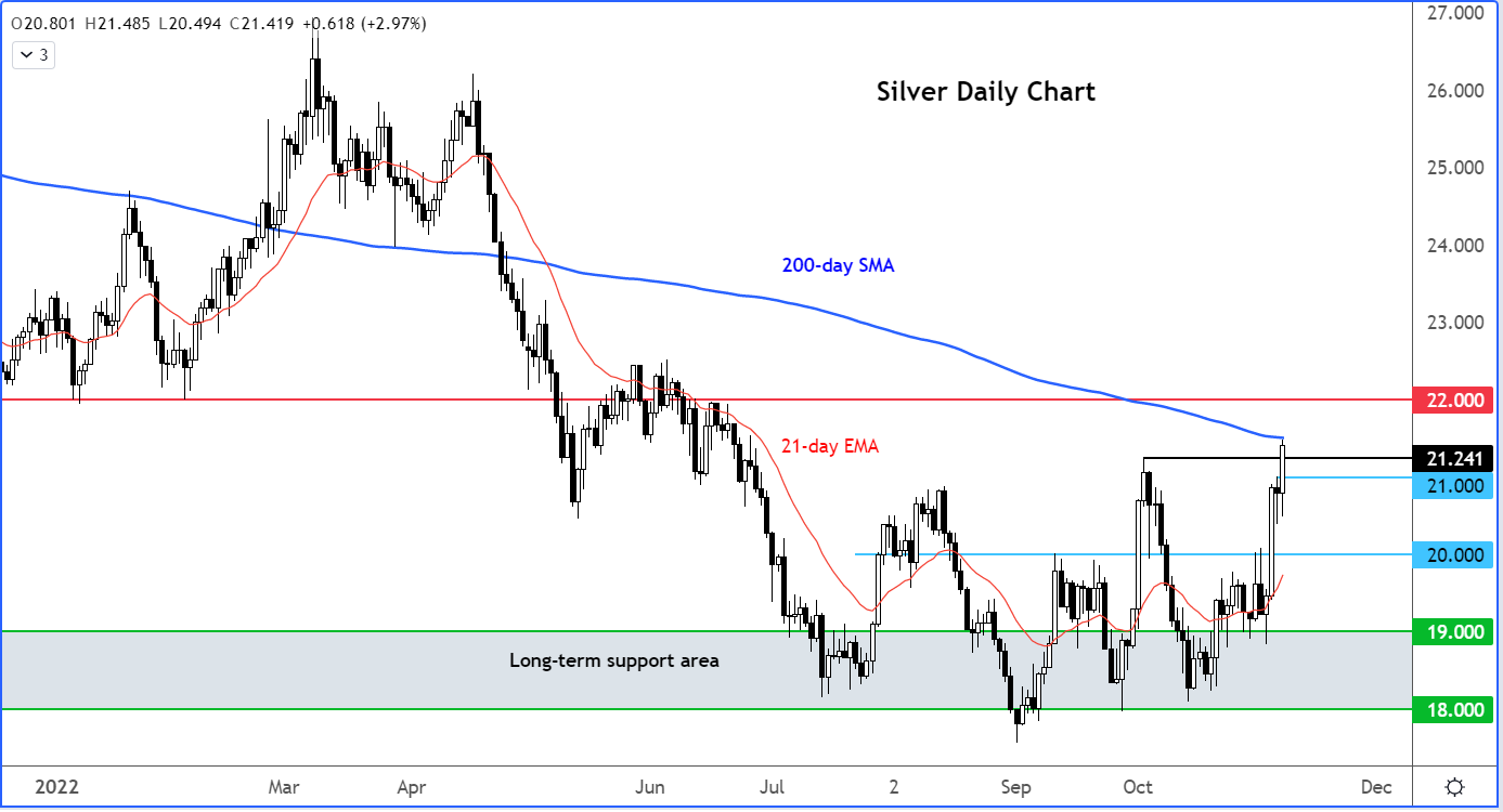 在这轮金属价格上涨中,白银上涨超过3%,考验200日均线。如果在这里要形成正式的反弹,那么银价需要撑住21.00美元附近的支撑位。
