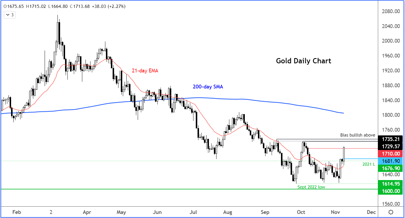 突破意味着阻力最小的短期方向现在再次上行。如果金价接下来能够突破1730-5美元附近的阻力位,那势头将更加高涨。如果发生这种情况,那么我们将看到多年来的首次出现高于前高的高位,形成可靠的看涨信号。不过,在这种情况发生之前,考虑到未来的CPI风险,我会对追涨持谨慎态度。