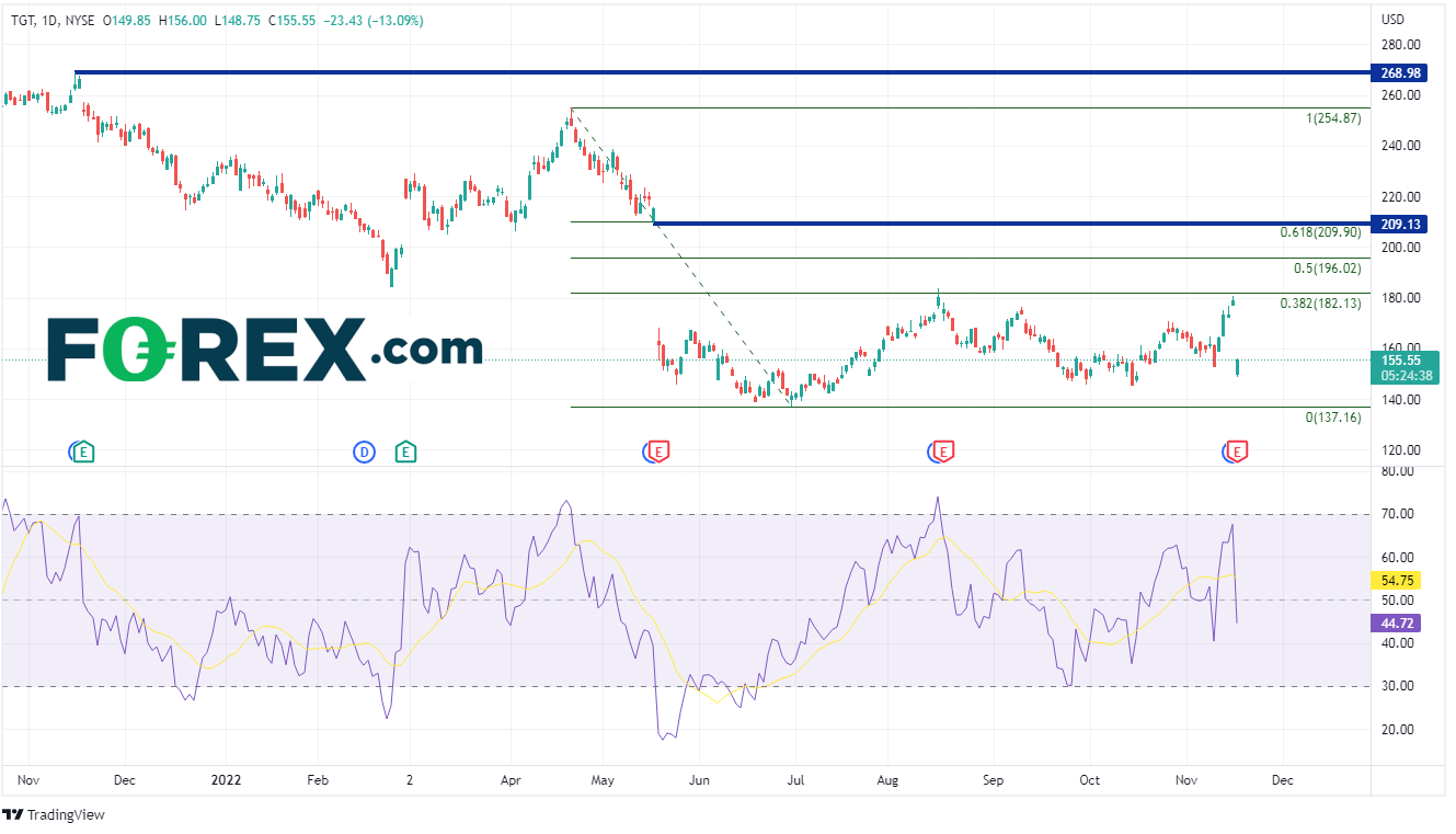 塔吉特的股价从2021年11月15日创下历史新高268.98后大幅下跌。该股在5月17日公布第一季度财报后从215.28下跌至163.07。股价在6月30日创下年初至今的低点137.26,然后反弹至4月21日高点至6月30日低点区间的38.2%斐波那契回撤位182.13附近。但在今天公布了欠佳的业绩之后,该股从昨天收盘价178.98跌至149.85!支撑位在6月30日低点137.16,而阻力位在跳空缺口176.90。