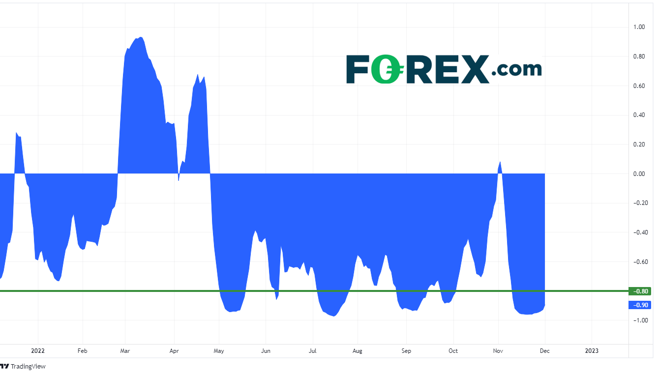 在今年的大部分时间里,黄金(XAU/USD)与美元呈负相关,尤其是美元指数(DXY)。也就是说,当美元指数走高时,黄金往往会走低。反过来也是如此。当美元指数走低时,黄金往往会走高。今年这两种资产之间的相关性从未像过去几周那样明显。自11月10日以来,相关系数一直低于-0.80。低于此数值意味着强负相关。因此,只要这种相关性保持在-0.80以下,当美元指数朝一个方向移动时,黄金就会朝相反的方向移动。