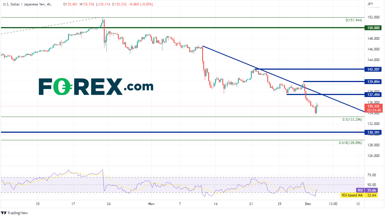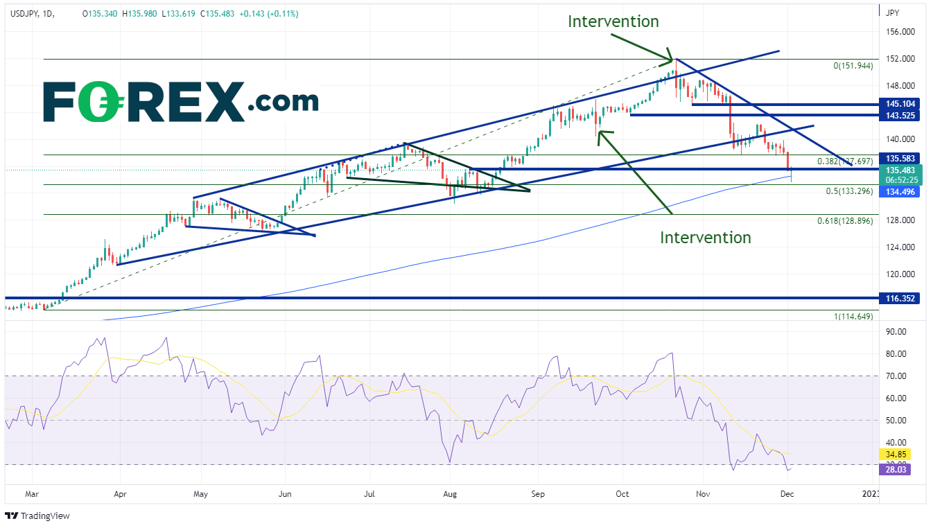 非农数据结果不仅对美元有利,它还助力美元/日元短暂跌破200日均线134.50,并在3月4日低点到10月21日高点区间的的50%回撤位获得支撑。另请注意,RSI已进入超卖区域,表明该货币对可能已准备好反弹。如果今天的K线收于当前点位(135.30)附近,它将形成T字星。此图形与超卖区域的RSI结合可能构成强势的反转信号。