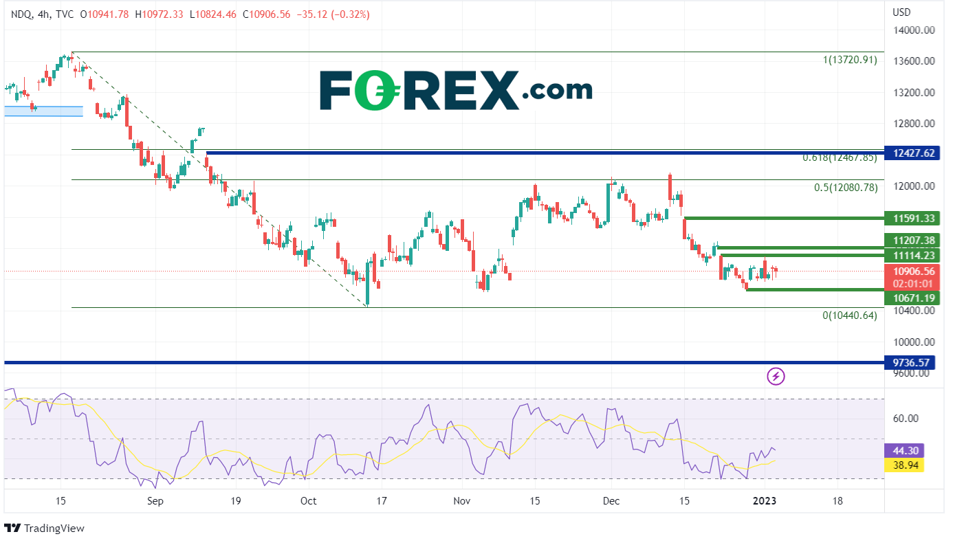 在240分钟图上,纳斯达克100指数自9月中旬以来一直在区间波动,交投于10月13日的低点10440.64以及从8月16日的高点到10月13日的低点区间的50%回撤位12080.78之间。鹰派的美联储会议纪要验证了2022年12月15日的会议结果。如果该指数继续走低,第一个支撑位在12月28日的低点10671。在此之下,价格可能会跌至10月13日的低点10440,然后是2020年7月的水平支撑位9736.57。然而,如果市场将会议纪要的鹰派视为“老调重弹”,纳斯达克100指数可能会形成涨势。第一个阻力位于2022年12月22日开盘的缺口位11114.23,然后是前一天的补缺位11207.38。在此之上,指数可能会触及2022年12月15日高点的开盘缺口位11591.33。