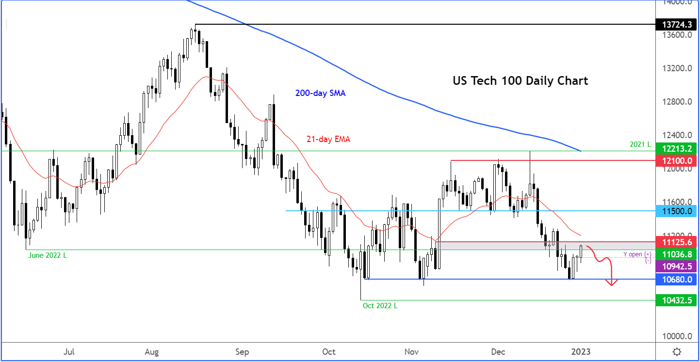 总而言之,我们在2022年面对的多数问题仍会延续至2023,包括高通胀和加息。经济衰退似乎无可避免。交易者清楚,自去年十月美国乃至全球股指开始大幅反弹,美联储鹰派立场缓和带来的大部分利好已被市场消化。因此,尽管今日全球股市高开,市场仍有下行风险。