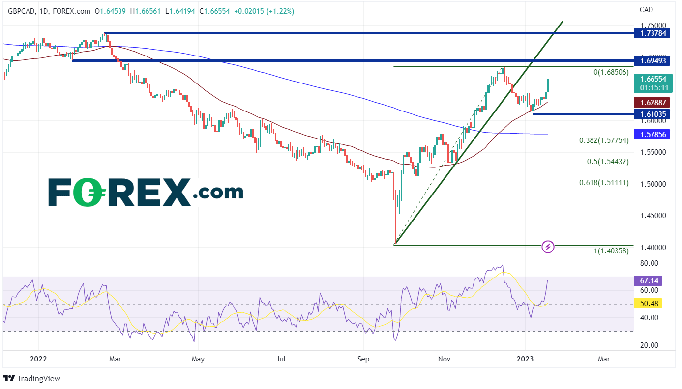 英国的通胀数据基本符合预期,从而支持了市场对英国央行在2月2日加息50个基点的预判。因此,如果想做多英镑但不确定具体的货币对,可以考虑走势清晰且上行空间明朗英镑/加元。