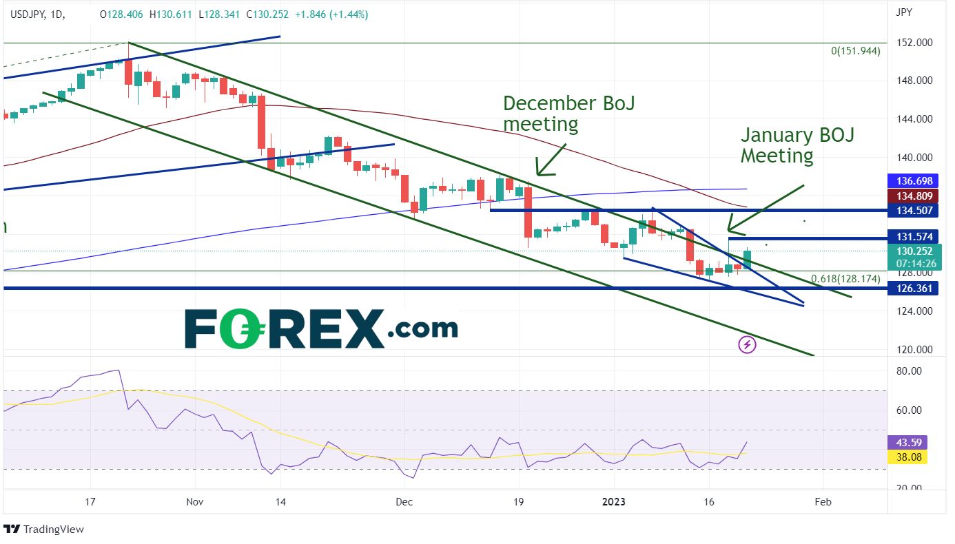 上周三,日本央行维持货币政策不变。此外,央行在12月的会议上将10年期日本国债的区间从+/-0.25%提高到+/-0.50%后,继续维持收益率曲线控制政策。结果,美元/日元上涨340点至131.57。然而,交易员趁机卖出美元并买入日元,当日汇率几乎未变。其他日元货币对也遵循类似的模式。请注意,汇率勉强保持在从2022年低点到2022年高点区间的61.8%斐波那契回撤位128.17以下。在黑田东彦今天的发言后,该货币对走势反转,正在重回周三日内高点的路上。