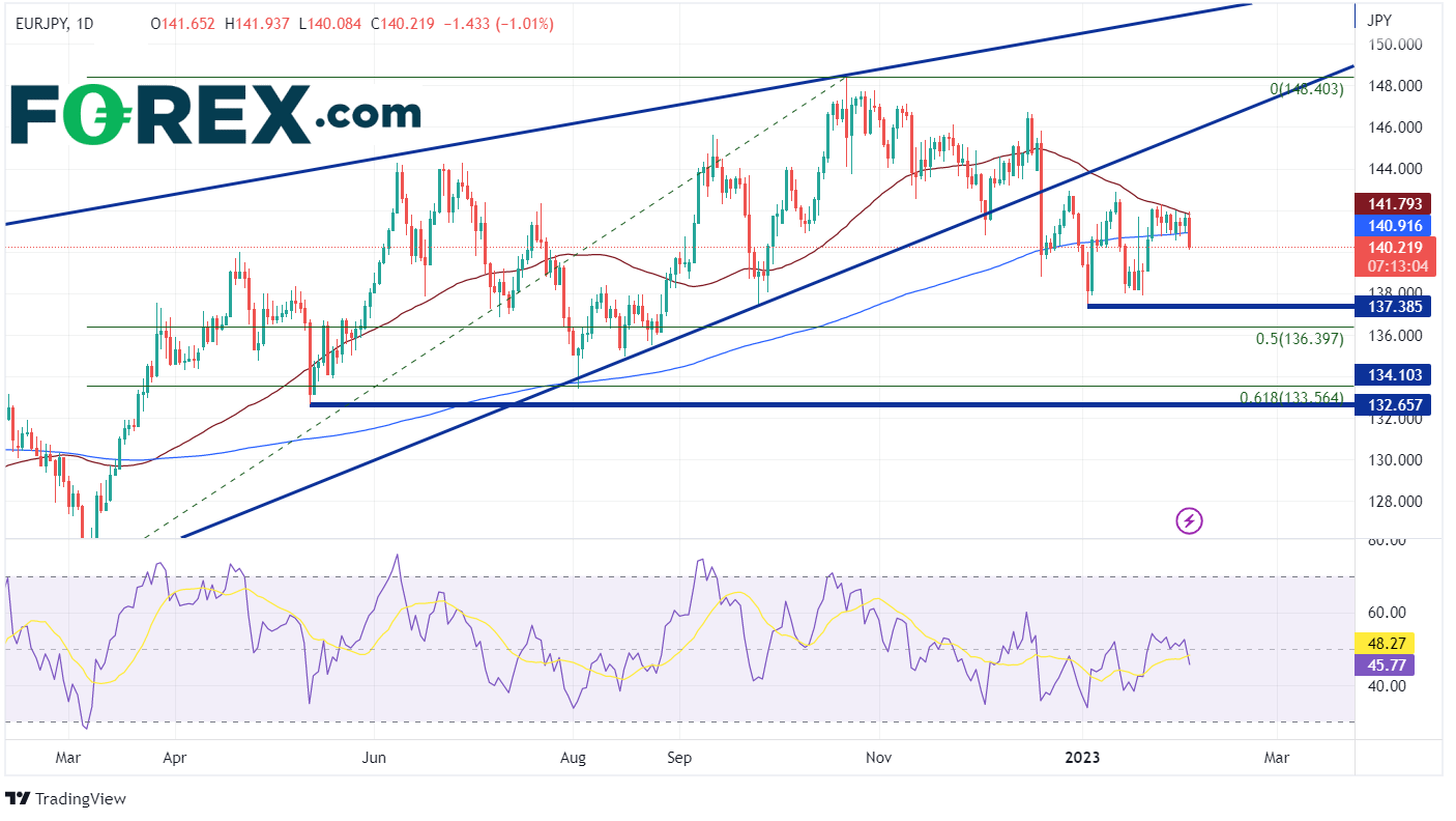 对加息和随后的新闻发布会反响最大的货币对之一是欧元/日元。在50日和200日移动平均线(140.92/141.79)之间横盘整理一周半后,欧元/日元大幅走低。该货币对跌破了最近的区间,并有足够的下行空间。第一支撑位在1月3日的低点137.39。在此之下,价格可能会跌至从2022年低点至2022年高点区间的50%回撤位136.40,然后是61.8%斐波那契回撤位133.56。阻力位很接近,位于近期区间的底部和200日移动平均线。在区间顶部和50日移动平均线上方,价格可能会移动到上升楔形(该货币对于2022年12月20日跌破楔形)的底部上行趋势线145.65附近。