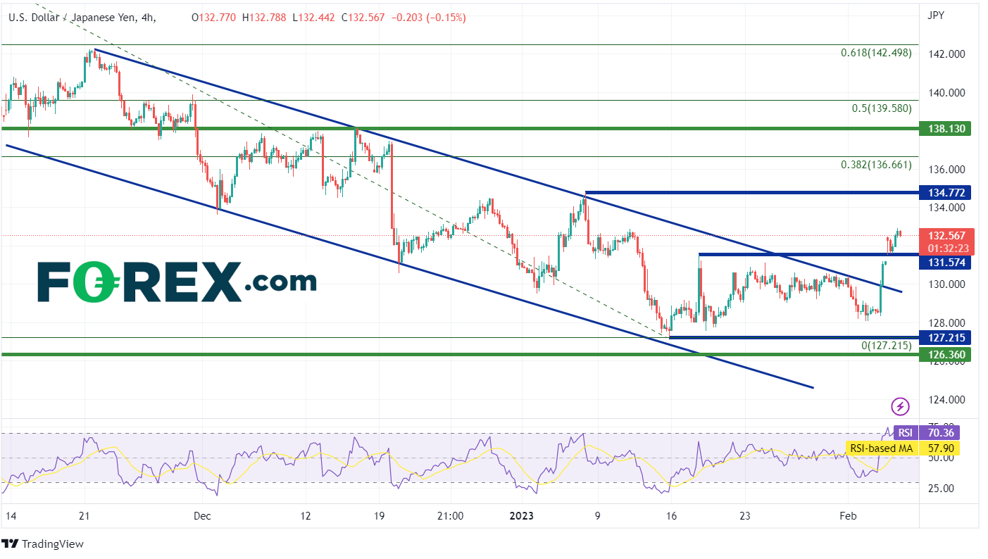 在240分钟图上,美元/日元已经形成了更窄的下行通道。但请注意,该货币对在周五突破了该通道的顶部趋势线。美元兑日元当天收于131.18,周一跳空高开至132.43。该货币对试图回补缺口,但被卡在先前区间的高点131.57附近。如果美元/日元继续走高,那么第一阻力位在1月6日以来的高点134.77。在此之上,价格可能会遇到复合阻力位,由2022年10月高点到1月16日低点区间的38.2%斐波那契回撤位136.66和200日移动平均线136.78(见日线图)构成,然后是之前的支撑/阻力位138.13。但是,请注意,更短的时间图上的RSI处于超买区域并拐头向下。这表明价格可能准备回调。第一支撑位在周一低点131.51。下一个支撑位是回补缺口131.20,然后是下行通道的顶部趋势线129.85附近。