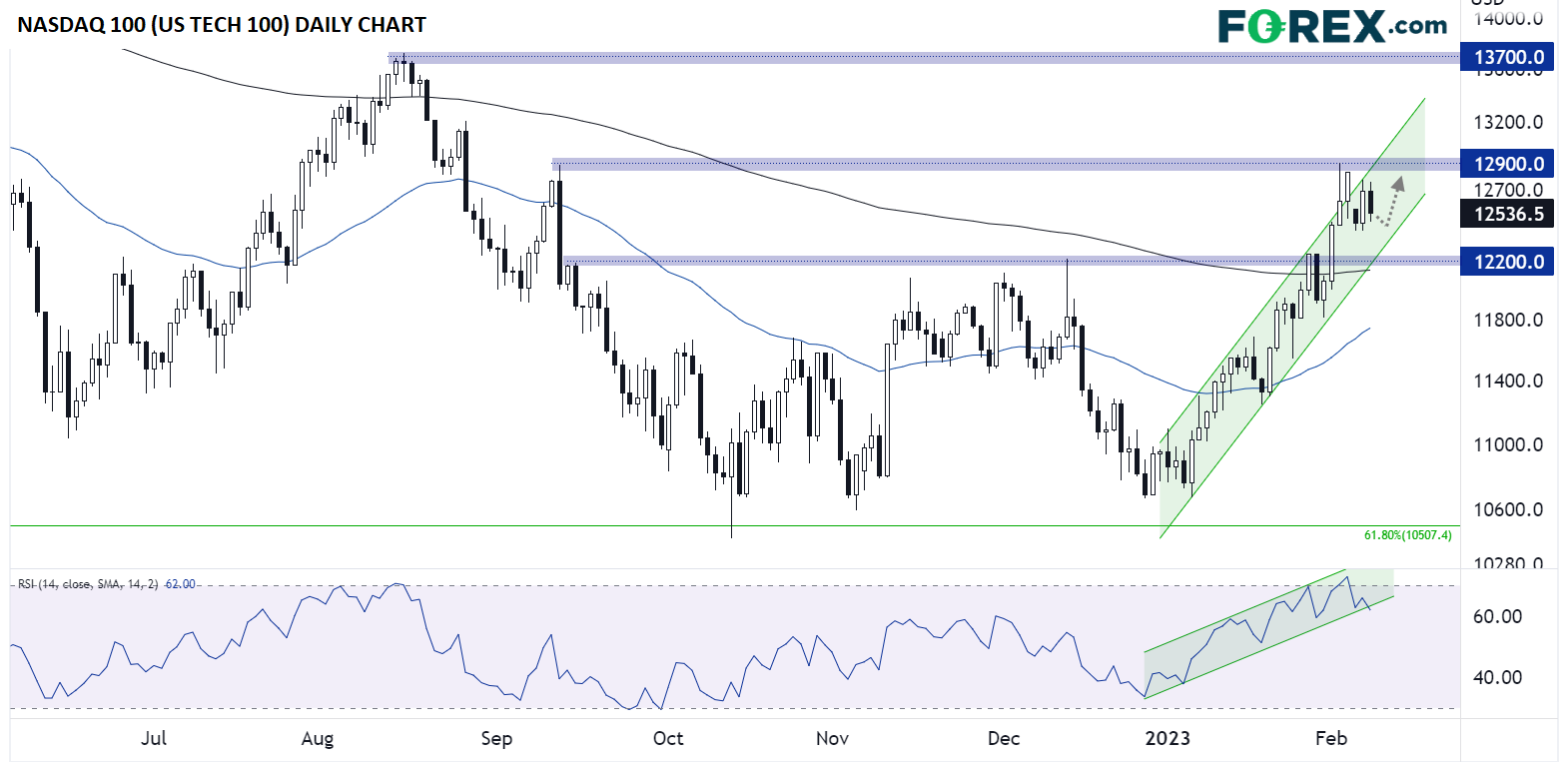 到目前为止,市场对美联储今日讲话的反响不大,因为交易员已经着眼于下周的CPI报告,视其为下一个应重视的主要数据。主要股指全线小幅走低,但从在周线上仍几乎走平。在美国主要股指中,纳斯达克100指数在技术面上看起来最为强势,至今仍延续反弹并维持在引导该指数全年走高的看涨通道内。