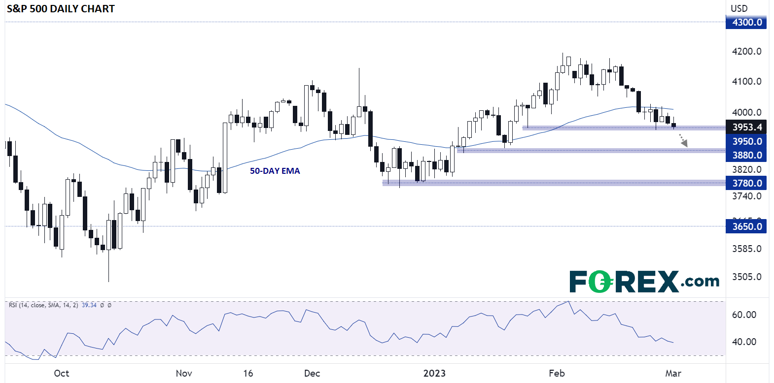 在ISM制造业PMI报告发布后,美国股指在周三早盘走低,交易员对美联储“长期走高”利率进行定价。如下图所示,标普500指数正在测试周五的盘中低点3,950附近,这是自1月20日以来的最低点。