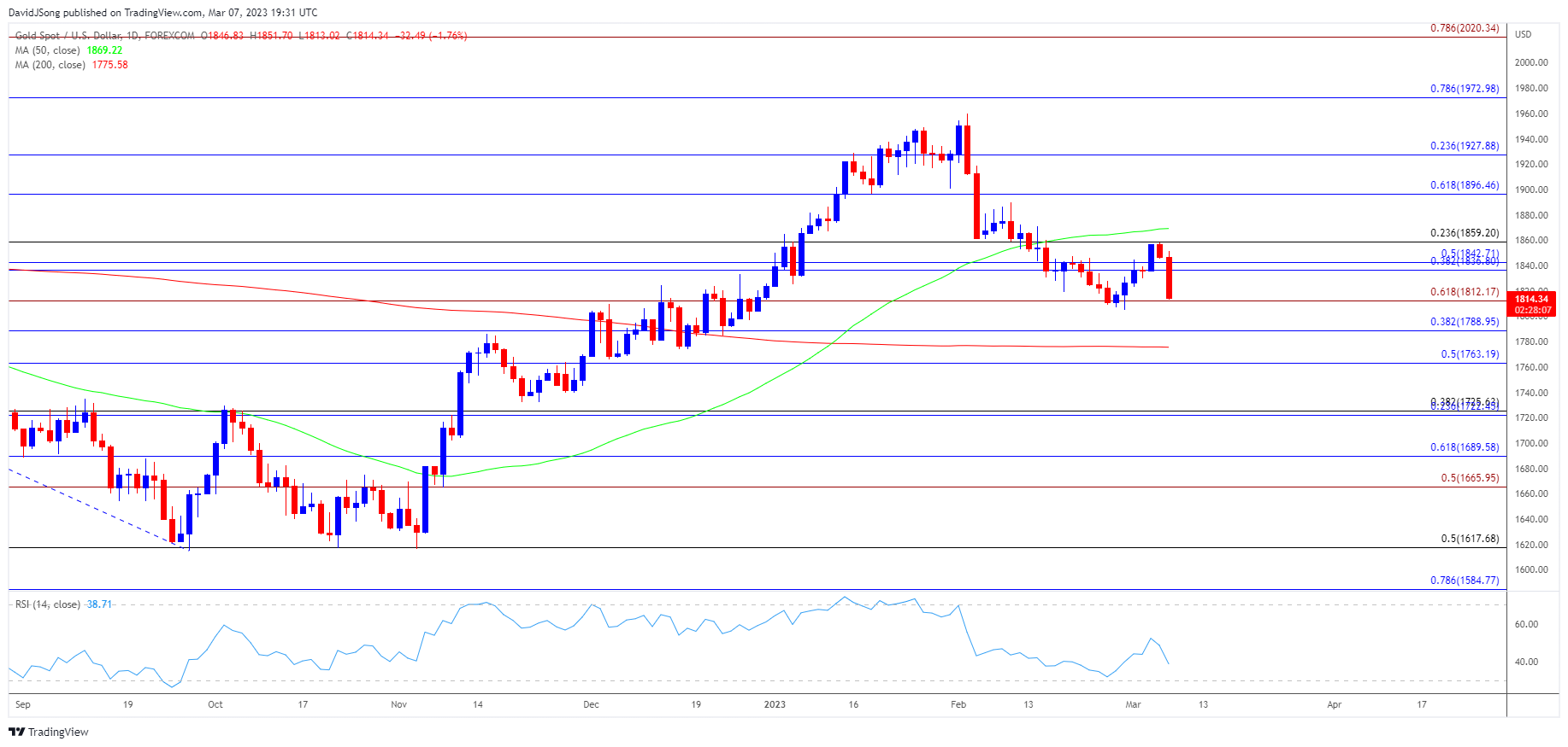 金价在努力突破1859美元(23.6%斐波那契回撤位)后创下月内新低(1816美元),若跌破/收盘低于1812美元(61.8%斐波那契延伸位),很可能测试2月低点(1805美元)。
